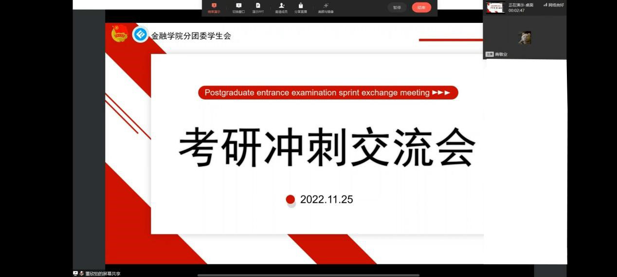 距2023年全国硕士研究生招生考试仅剩一个月,为给2023届考研学子加油鼓劲,助力考研学子坚定信心、调整状态、科学合理安排冲刺阶段的备考,11月25日19:30,bat365中文官方网站在企业微信线上举办考研冲刺交流会。bat365中文官方网站党委书记、副院长石世明,bat365中文官方网站党委副书记、纪委书记余新参加了会议。同时邀请2022届考研成功的优秀校友为同学们分享经验,鼓舞信心。