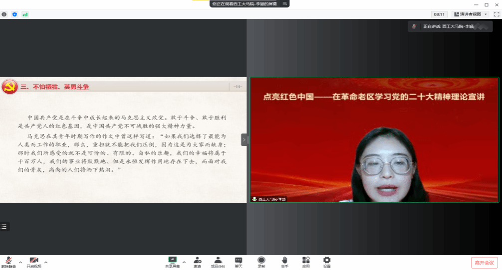 最后,实践队队员赵双红同学作了《以青春之力托举中国式现代化》的主题宣讲,贯通古今,展望未来,对中国式现代化的深刻内涵、发展历程和时代使命进行了系统阐述。基于党的二十大报告的表述,阐释了中国式现代化的内涵,分析了中国式现代化这一人类文明新形态的鲜明特色;分阶段梳理了新中国成立以来中国式现代化的发展历程,启迪我们勿忘昨天;通过讲述抗击疫情、基层服务、国防建设中青年助力中国式现代化的感人故事,感召新时代青年要努力奋进、无愧今天;阐释分析习近平总书记在党的二十大报告中“要把青年工作作为战略性工作来抓”的深刻意蕴,号召新时代青年要脚踏实地,锐意创新,让青春在全面建设社会主义现代化国家的火热实践中绽放绚丽之花。