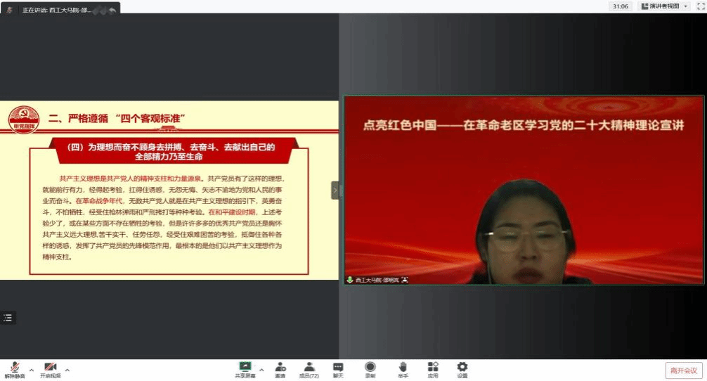 其次,实践队队员李颖同学以《伟大建党精神》为主题开展宣讲,从信仰追求、政治品格、顽强意志、优良作风四个方面对伟大建党精神作了深刻阐释。通过讲述红船故事、独臂将军陈波与他的党证故事,阐明中国共产党始终坚持真理、坚守理想;通过分享开国将军甘祖昌和“七一勋章”获得者张桂梅的感人事迹,指出中国共产党百年奋斗史,就是为人民谋幸福、为民族谋复兴的奋斗史;通过讲述海军航空兵飞行员王伟和百坭村驻村第一书记黄文秀的事迹,刻画了敢于斗争、敢于胜利是共产党人的红色基因,是中国共产党不可战胜的强大精神力量;带领学习王若飞的英雄事迹、解放军百万雄师横渡长江的故事,一同体悟中国共产党人始终对党忠诚、不负人民的政治品格。人无精神不立,国无精神不强。李颖同学号召新时代青年,要深入学习伟大建党精神的内涵和要求,将其内化于心,外化于行。
