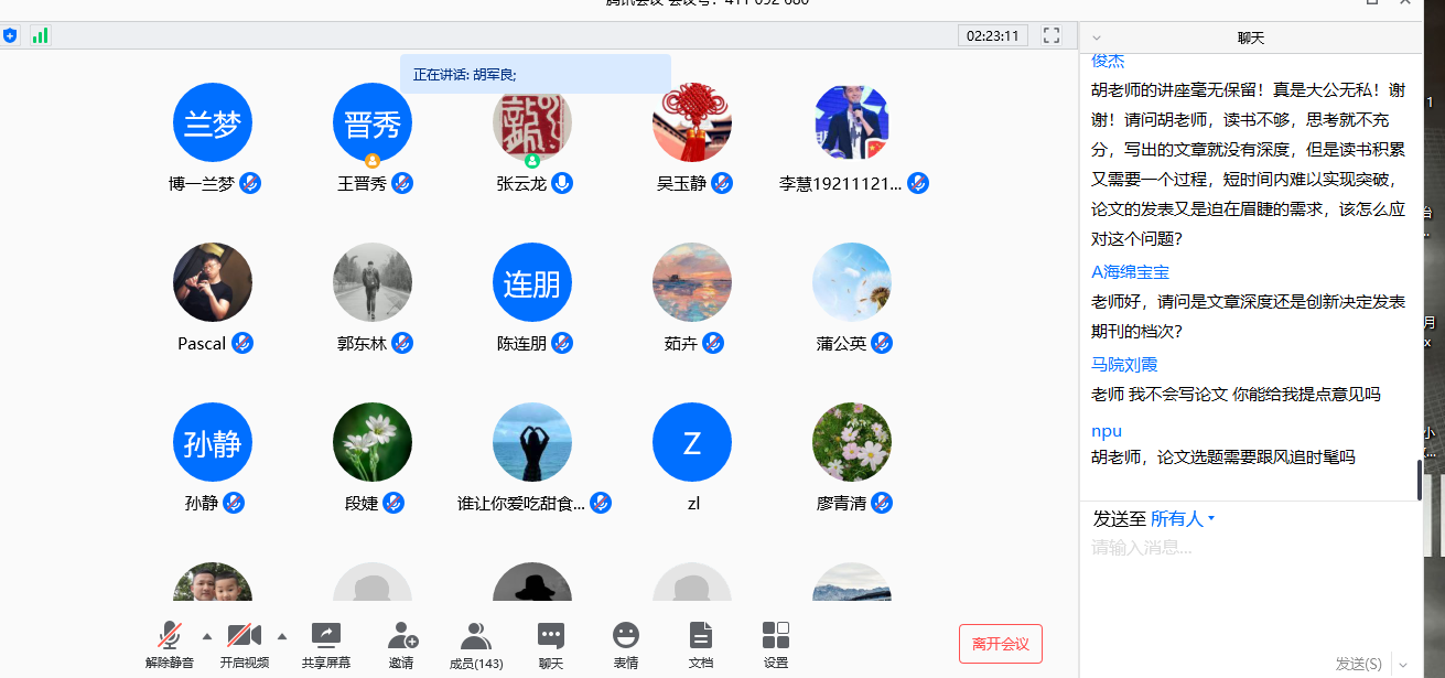 在听完近三个小时的讲座后,同学们也纷纷留言,表示胡老师的讲授“干货”满满、精彩实用、收获颇多、意犹未尽等。最后,主持人对胡军良教授再次表示感谢,并期待胡教授有机会再给我们带来精彩纷呈的报告。