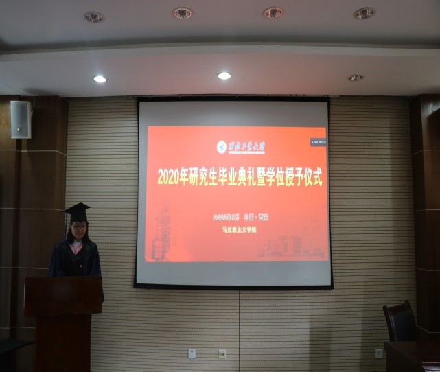 随后,学院举行了分会场学位授予仪式,由党委副书记李刚主持。仪式开始,学院党委书记吴闻川宣读了马院2020年研究生毕业名单,紧接着硕士毕业生代表王酒莉同学发言,她代表毕业生诚挚地表达了对学校、学院的敬意,用朴实的文字记录着三年来的点点滴滴,并借用梁启超在《中国少年说》中唤醒青年的话语,激励同学们勇担时代之责,为国家贡献自己的青春力量。然后,学院师长为毕业生赠送了毕业礼物,鼓励同学们在新的工作岗位上大展鸿图。研究生导师郝保权作为导师代表对毕业生寄予希望,希望同学们在以后的工作、学习、生活中,保持定力,保持警醒,奋发向上,干事创业。在未来的日子里,像朝阳一般,心有芳华,无惧岁月,做一个有朝气、有志气、有底气、有骨气的新时代马克思主义青年。最后,必赢242net官网院长、学位评定委员会分会主席杨云霞老师与同学们交流,她勉励毕业生在今后的日子里,更要勤奋努力,百尺竿头更进一步。作为马院第一届毕业的研究生,我们共同见证了马院的发展,共同为学院的进步付出了努力和心血,特别是在2020年4月2日成功取得马克思主义理论一级学科博士点,更是让所有人终身铭记,同时学院也见证了同学们的成长成才,希望毕业生们在步入社会以后,常回来看看,分享成功和喜悦,在未来的时光里,展现青马风采,前程似锦,大有作为!