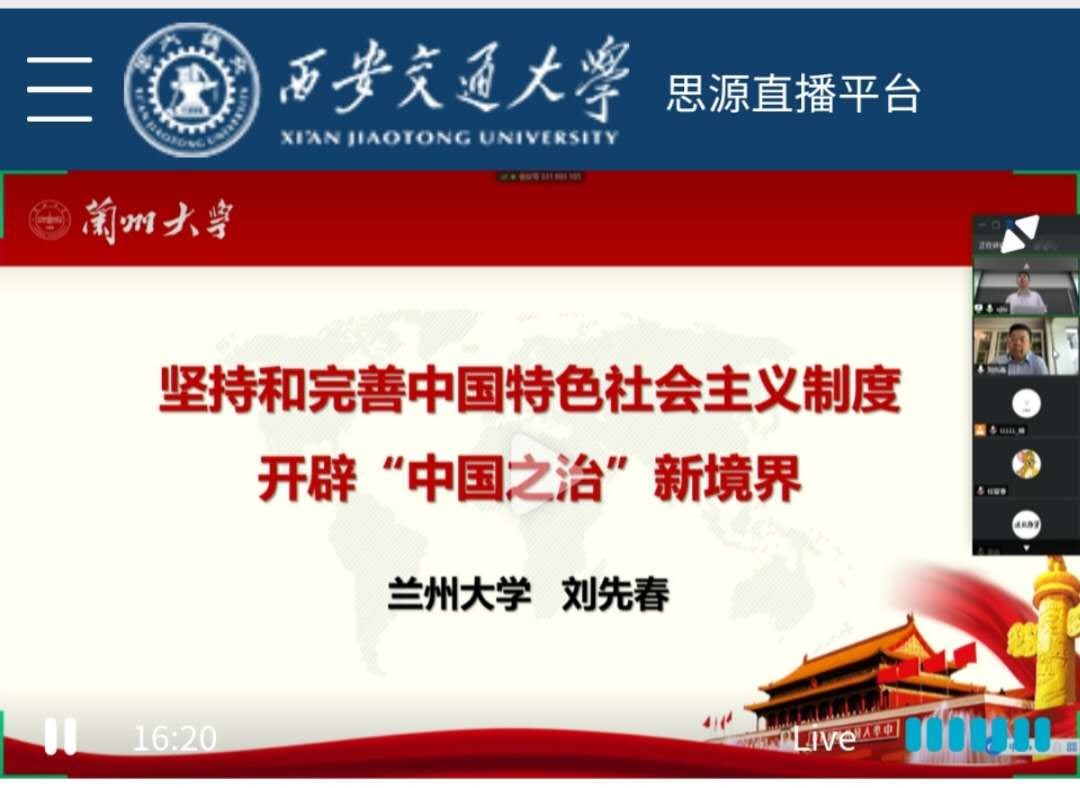 6月12日上午,根据省教工委安排,必赢242net官网组织全院师生收看了形势与政策高端报告会。兰州大学必赢242net官网教授、博士生导师,中央马克思主义理论研究和建设工程首席专家,教育部教学指导委员会委员刘先春教授线上为全省高校师生作了《坚持和完善中国特色社会主义制度开辟“中国之治”新境界》的主题报告。