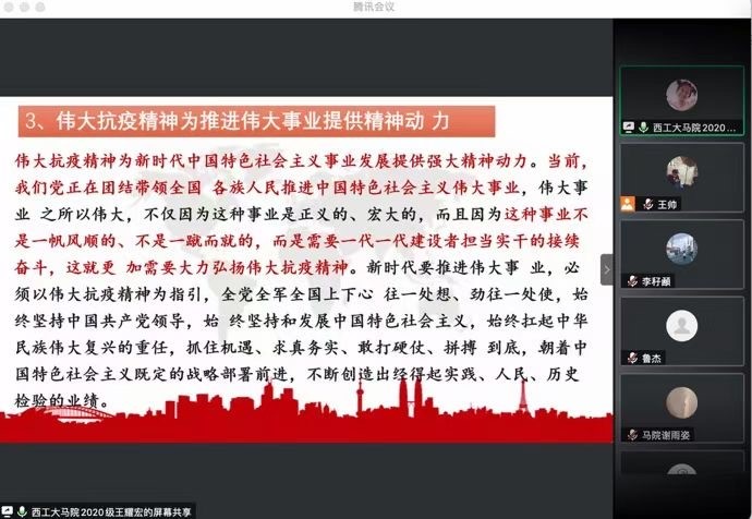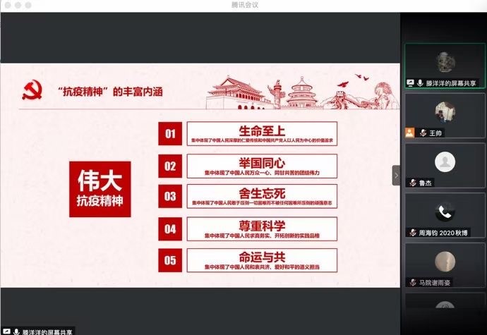 “抗疫精神”蕴含着丰富的内容和深刻的内涵,具有坚定的政治导向和强烈的感染力。在此次抗击疫情的伟大斗争中,广大青年学生争当志愿者,为控制疫情、打赢疫情阻击战,贡献了自己的力量,他们本身也是“抗疫精神”的创造者。“抗疫精神”为高校提供了鲜活的社会主义核心价值观爱国主义教育素材,将“抗疫精神”融入高校思想政治教育有利于涵养当代大学生的社会主义核心价值观,同时也坚定大学生对于中国特色社会主义制度的自信和认同。通过此次读书会,参会的师生们更加懂得如何把抗疫精神融入到日常学习和生活之中,要在日常生活中养成勤洗手、讲卫生、做防护、强身健体等良好习惯,在学习工作中更加深刻感悟抗疫精神所蕴含的伟大力量,要将此伟大力量在潜移默化中扎根头脑、躬行实践,将抗疫精神落实到具体行动当中,化精神为奋斗向上的力量,为中华民族伟大复兴而努力学习,为实现梦想而拼搏奋斗。
