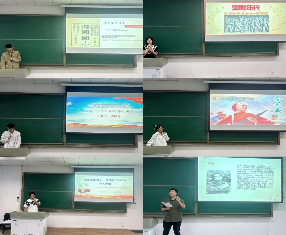 参赛同学们选择的书籍种类和内容契合主题、丰富多彩。既包括现代文学大家鲁迅、茅盾揭示近代中国社会弊病的小说《阿Q正传》《子夜》,也包括革命文艺小说《林海雪原》《红岩》;还有描写共产党人投身革命事业、忠诚理想信念的《觉醒年代》《红星照耀中国》,也有反映改革开放艰难起步的《平凡的世界》;当代知识分子献身国防科技事业的赤诚与无悔的《国家至上》,还包括党的二十大报告等展现中国社会发展进步,逐步迈向中华民族伟大复兴的红色经典。为提高展示水准,部分同学还充分利用影音视频资料,截取影视作品片段辅助PPT呈现,并结合个人经历与在场观众共同探讨和分享书籍带来的智慧和乐趣。同学们畅谈自己对作品、人物、时代的理解,表达对建设祖国的抱负与决心,将分享会推向高潮,赢得了在场观众的阵阵掌声。