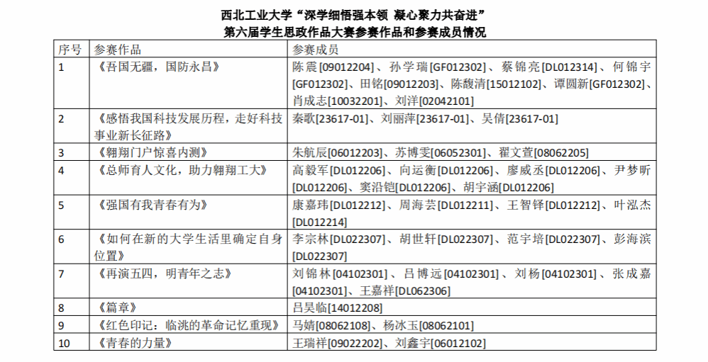 为扎实有效推进学习贯彻习近平新时代中国特色社会主义思想主题教育,深刻理解和把握习近平新时代中国特色社会主义思想的真理力量和实践伟力,引导我校学生在深学细悟中提高理论素养,坚定理想信念,厚植爱党爱国情怀,在学思用贯通、知信行统一中锤炼过硬本领,勇于担当作为,切实将“学思想、强党性、重实践、建新功”的总要求落地落实,为强国建设、民族复兴凝心聚力。必赢242net官网党委学生工作部、必赢242net官网面向全校学生开展“深学细悟强本领 凝⼼聚力共奋进”第六届学生思政作品⼤赛。现将参赛作品和参赛成员予以公示。公示期间如有问题请向必赢242net官网相关负责人反映。