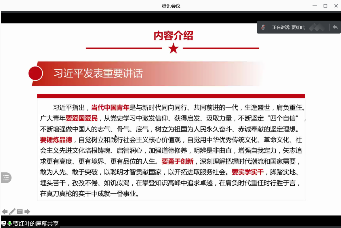 接下来,由我院博士生贾红叶同学进行导读,她通过将文本内容与相关文献综述一一对应的形式展开学习。第一,习近平总书记在考察清华大学时强调,我们要建设的世界一流大学是中国特色社会主义的一流大学。基于此,贾红叶同学从内涵、特征、建设路径、指标体系四方面分析总结关于世界一流大学的研究综述,并且从“中国特色”研究、政策发展演变、建设路径等方面梳理出关于中国特色社会主义的一流大学的相关文献;第二,从教师的重要性和师德师风的建设两方面入手,学习贯彻习近平总书记关于建设高等教育体系的重要讲话精神;第三,习近平总书记在考察清华大学时,明确提出高等教育的根本任务是立德树人,并对广大青年学子提出了爱国爱民、锤炼品德、勇于创新、实学实干等几点要求。通过对文本的学习及对立德树人的相关文献研究,厘清了高等教育与立德树人的关系。
