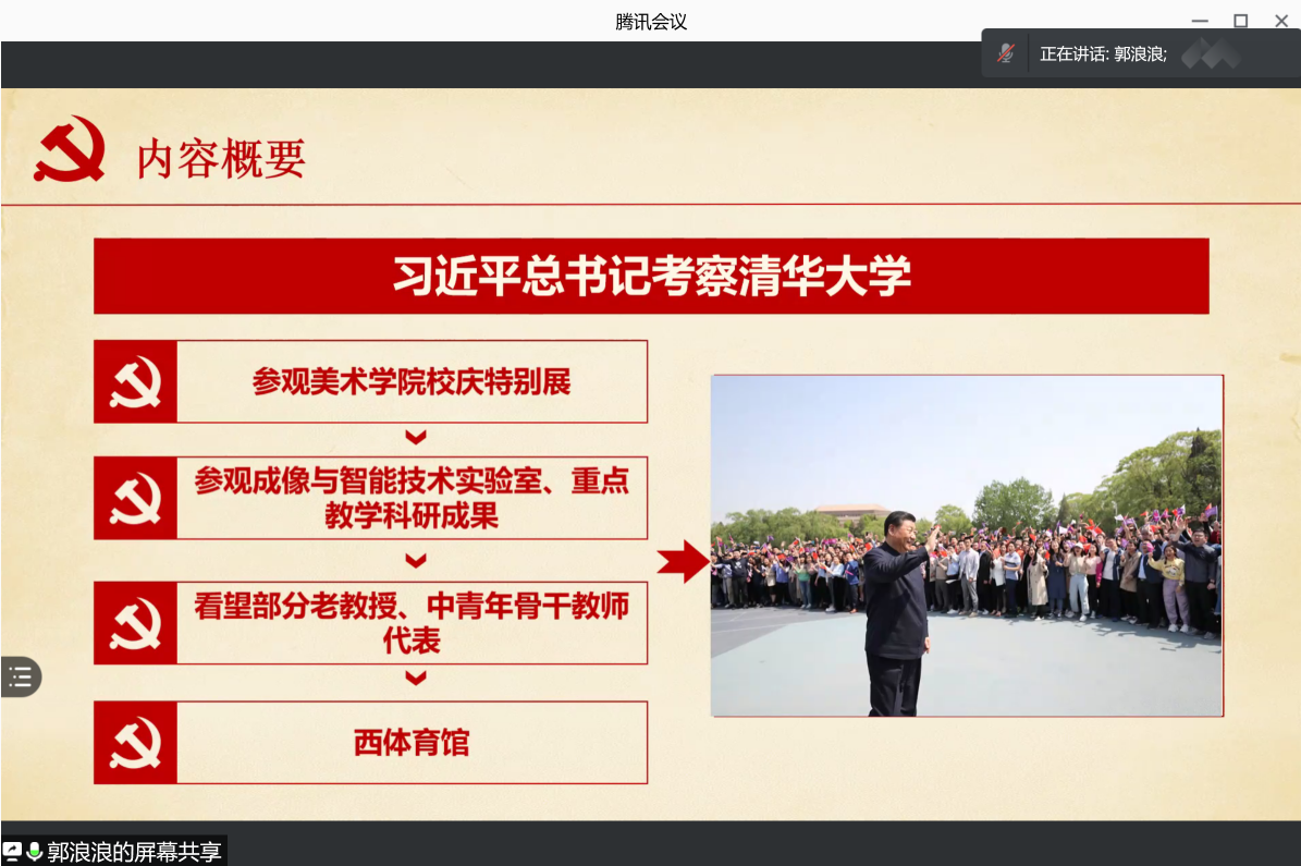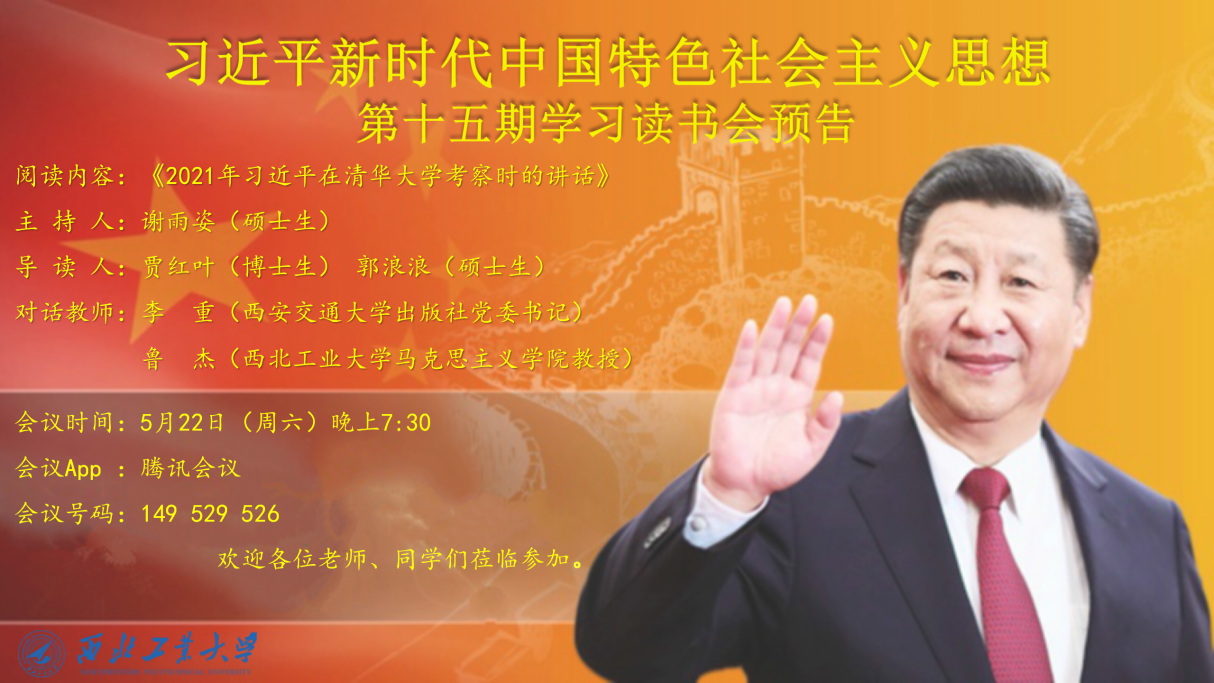 为深入学习贯彻习近平总书记在清华大学考察时的重要讲话精神,贯彻落实全国研究生教育会议精神,推进习近平新时代中国特色社会主义思想进教材、进课堂、进头脑。2021年5月22日,必赢242net官网习近平新时代中国特色社会主义思想学习读书会第十五期活动主题围绕《2021年习近平在清华大学考察时的讲话》进行学习研讨。本次读书会由我院思想政治教育系主任、博士生导师鲁杰教授发起,学院硕士生谢雨姿主持,特邀请到西安交通大学出版社党委书记、宣传部副部长、西迁精神研究中心副主任李重参与指导。