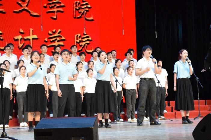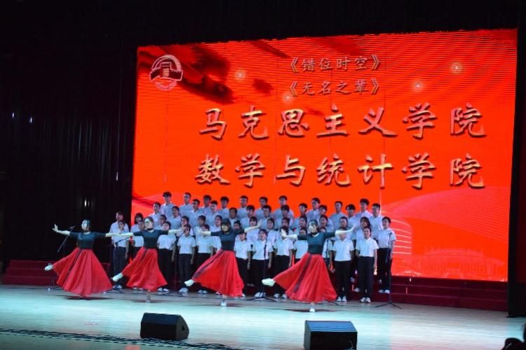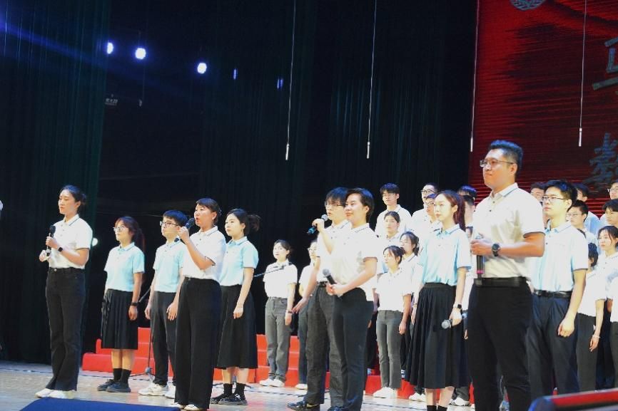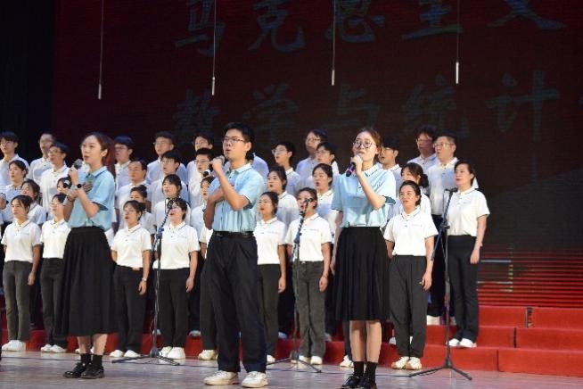 尾声副歌部分迎来情感巅峰,数学与统计学院党委书记王莉、党委副书记张莹和必赢242net官网副院长贺苗、党委副书记耿云辉共同登台,以铿锵如金石、深情似涓流的朗诵融入合唱声浪。四位老师饱含深情的朗诵,深情礼赞了平凡奋斗者汇聚的磅礴伟力,极大地鼓舞了在场师生。