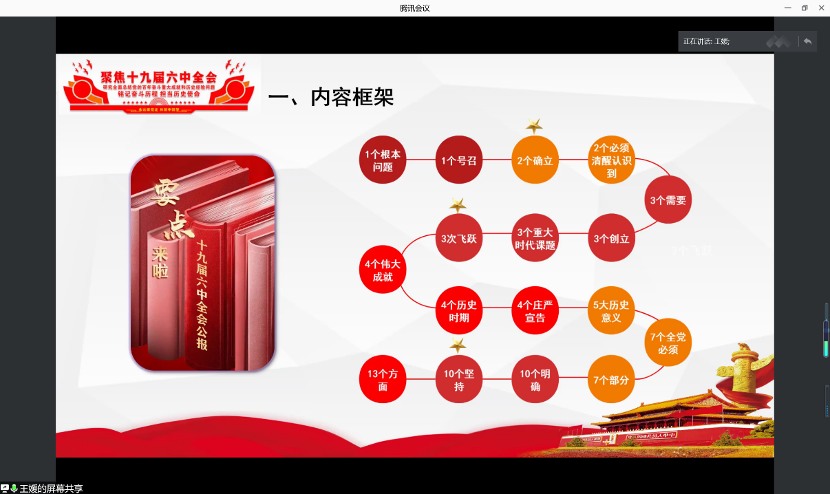 接下来,由学院博士生王媛同学进行导读。内容共分为三大部分进行阐释分析。第一部分,内容框架。以数字为线索清晰的列出了整个决议的总体内容,分别是1个根本问题、1个号召、2个确立、2个必须清醒认识到、3个需要、3个创立、3个重大时代课题、4个历史时期、4个伟大成就、4个庄严宣告、5大历史意义、7个全党必须、7个部分、10个明确、10个坚持、13个方面。第二部分,专题分析。专题一:“两个确立”的重要意义。“两个确立”是马克思主义的内在属性、“两个确立”是中国共产党的宝贵经验、巩固党的十八大以来取得的伟大成就、新时代党和国家事业发展、推进中华民族伟大复兴历史进程的现实需要、彰显了人民性、历史性和时代性的高度统一。专题二:马克思主义中国化的“第三次”飞跃。习近平新时代中国特色社会主义思想是当代中国马克思主义、二十一世纪马克思主义,是中华文化和中国精神的时代精华,实现了马克思主义中国化新的飞跃。专题三:十个坚持”的科学内涵与逻辑关系。为什么要提“坚持”?“坚持”既是底线思维的体现,也象征着战略定力,就是要绵绵发力、久久为功。为什么要提“十个坚持”?是因为这十个方面是具有根本性和长远指导意义的十条历史经验。第三部分,学习心得。在学习过程中要一字一句学、结合起来学、带着信仰学、带着问题学,也为今后同学们深入学习带来思考。
