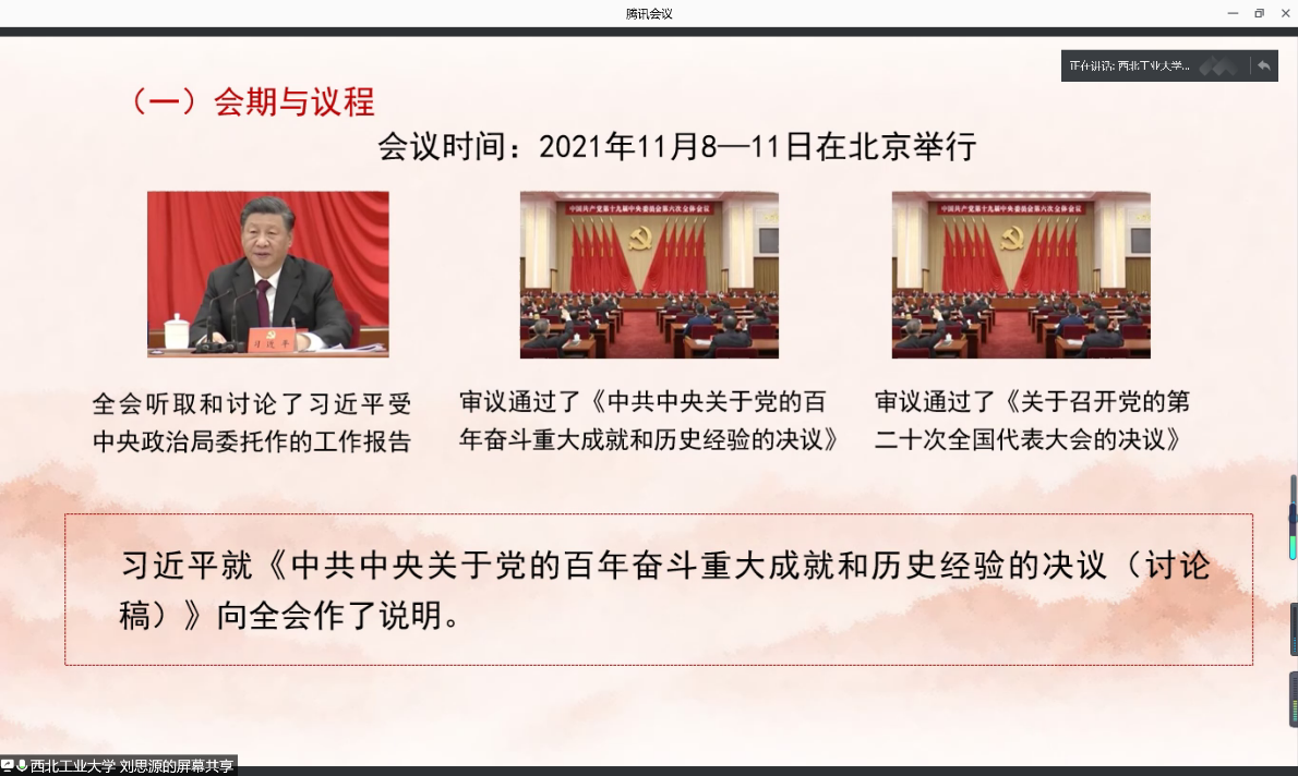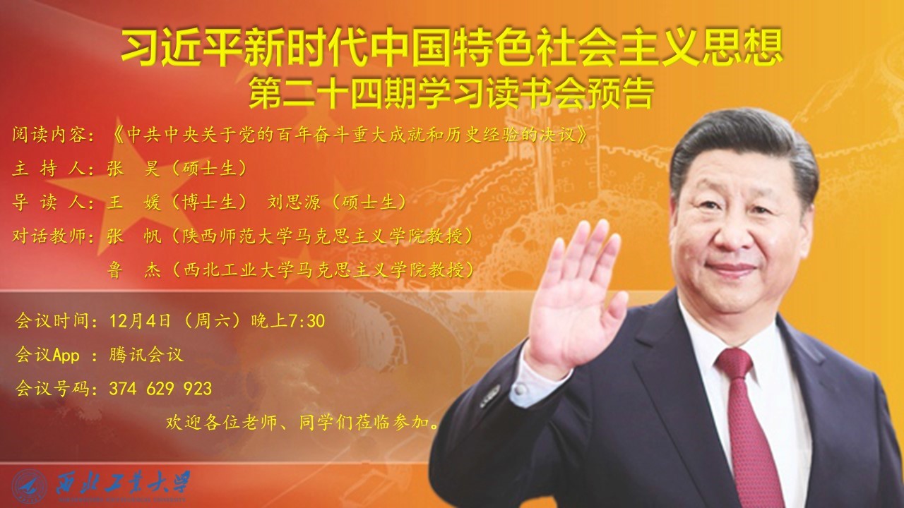 为深入学习十九届六中全会决议,推进习近平新时代中国特色社会主义思想进教材、进课堂、进头脑。2021年12月4日,必赢242net官网习近平新时代中国特色社会主义思想学习读书会第二十四期活动主题围绕《中共中央关于党的百年奋斗重大成就和历史经验的决议》进行学习研讨。本次读书会由我院思想政治教育系主任、博士生导师鲁杰教授发起,学院硕士生张昊主持,陕西师范大学必赢242net官网张帆教授作为对话教师应邀参加,学院党委副书记李刚老师全程参与读书会活动。