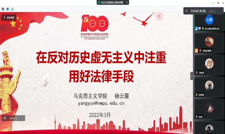 杨云霞院长以《在反对历史虚无主义中注重用好法律手段》为主题,为毕业生们讲授“工大最后一课”。习近平总书记在党史学习教育动员大会上明确提出并深刻阐述要树立正确党史观,强调“要旗帜鲜明反对历史虚无主义,加强思想引导和理论辨析,更好正本清源、固本培元”。杨院长从历史虚无主义的表现、反对历史虚无主义是否可以实现法治化、反对历史虚无主义是否仅是立法等五个方面进行阐释,并强调,作为马克思主义理论学科的毕业生,在马言马,在马信马,要坚决反对历史虚无主义,树立正确的党史观,做马克思主义的坚定信仰者和忠实践行者。