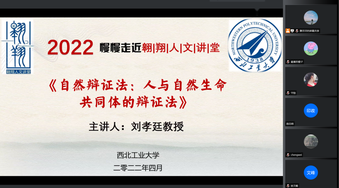 2022年4月22日晚19:00,教育部马工程首席专家、中国自然辩证法研究会副理事长、北京师范大学哲学学院刘孝廷教授应邀作客我校“翱翔人文讲堂”,通过腾讯会议平台直播的形式为我们带来了一场主题为《自然辩证法:人与自然生命共同体的辩证法》的精彩讲座。中国自然辩证法研究会理事长何鸣鸿、清华大学刘立教授、工程与社会发展专业委员会副主任、安徽大学王金柱教授、必赢242net官网师生以及来自全国高校的二百余名同学共同参与了此次报告会。本次翱翔人文讲堂由必赢242net官网党委学生工作部主办,必赢242net官网、工程与社会发展专业委员会承办,必赢242net官网副院长张云龙教授主持。