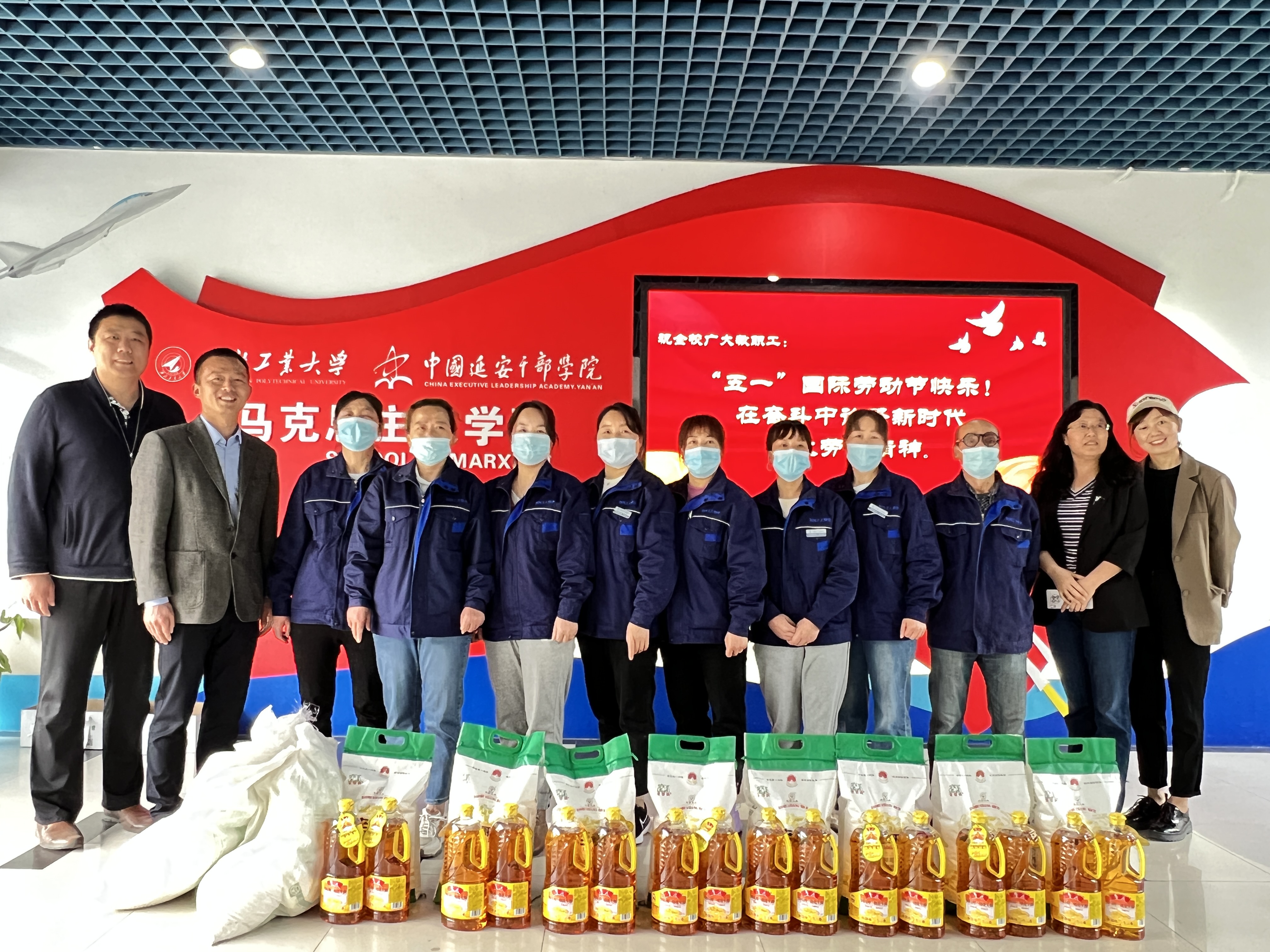 在五一国际劳动节到来之际,学院党委副书记(主持工作)蒲传新、学院工会主席高旭红,代表全院师生看望慰问了学院楼的物业值班工作人员,送上生活物资和节日礼物并预祝马院全体人员度过一个舒心快乐安全的假期!