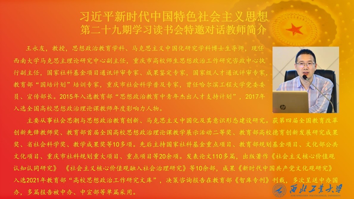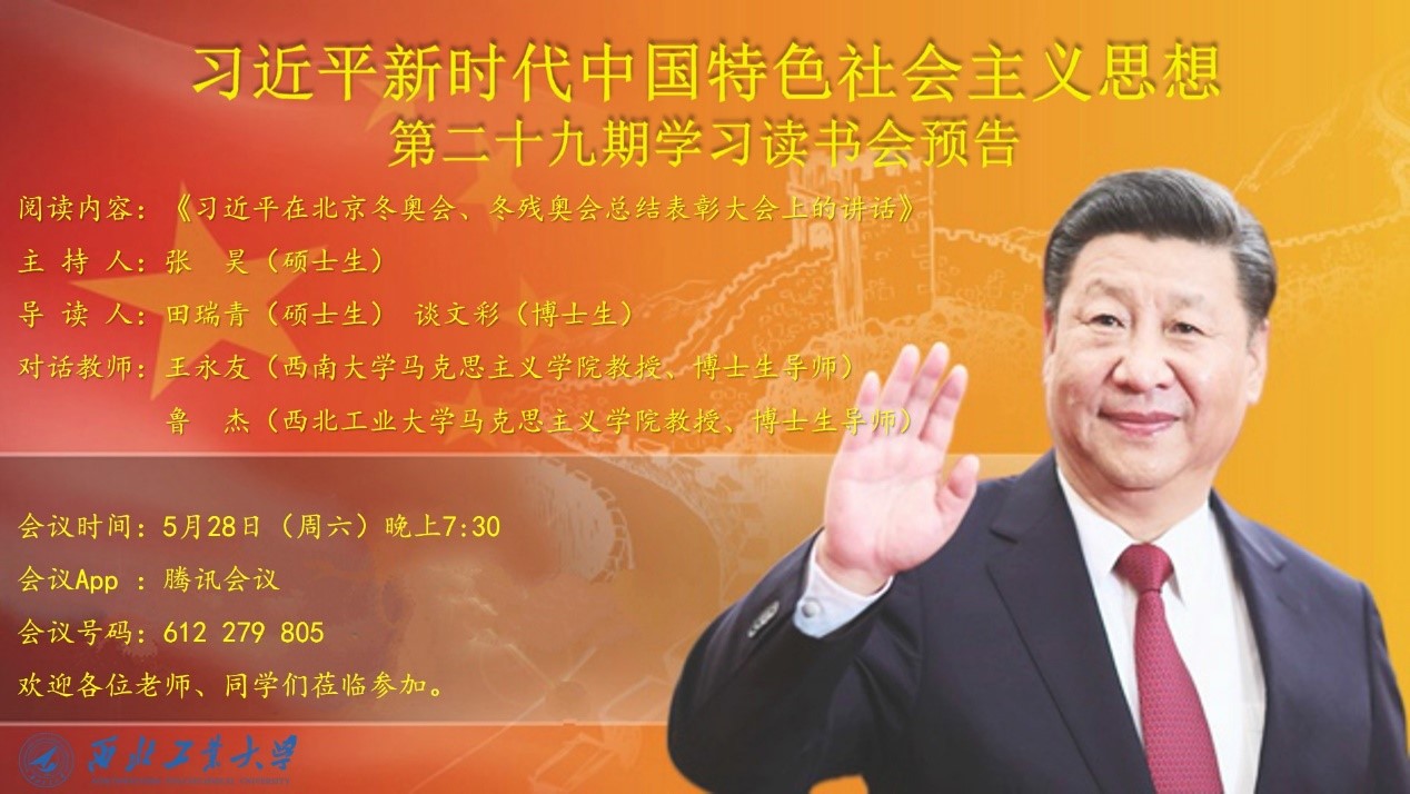 为深入学习十九届六中全会决议,推进习近平新时代中国特色社会主义思想进教材、进课堂、进头脑。2022年5月28日,必赢242net官网习近平新时代中国特色社会主义思想学习读书会第二十九期活动主题围绕《习近平在北京冬奥会、冬残奥会总结表彰大会上的讲话》进行学习研讨。本次读书会由我院思想政治教育系主任、博士生导师鲁杰教授发起,学院硕士生张昊主持,西南大学必赢242net官网教授、博士生导师王永友教授作为对话教师应邀参加,学院党委副书记李刚老师全程参与读书会活动。