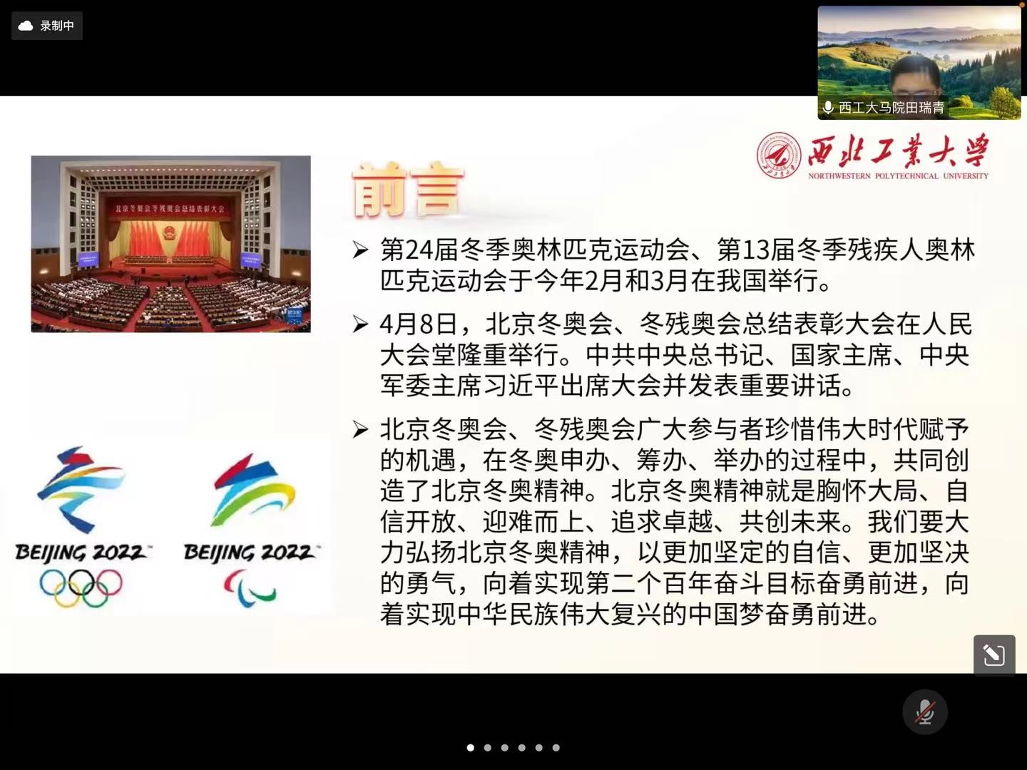 读书会的第一位导读人是我院硕士生田瑞青同学。他从四个部分展开:第一部分,北京冬奥会、冬残奥会的举办历程。从奥运梦开始,历经申办、举办到圆满成功,2013年11月3日,中国奥委会正式致函国际奥委,提出申办2022年冬奥会、冬残奥会,到2022年2月4日晚,第二十四届冬季奥林匹克运动会开幕式在国家体育场举行。中共中央总书记、国家主席、中央军委主席习近平出席开幕式并宣布本届冬奥会开幕,历时九年,我国实现了成功举办冬奥会的目标。第二部分,《讲话》的内容解读。此次讲话的目的在于总结北京冬奥会、冬残奥会的经验;表彰突出贡献集体和突出贡献个人;弘扬北京冬奥会、冬残奥会筹办举办过程中培育的崇高精神;激励全党全国各族人民为实现第二个百年奋斗目标、实现中华民族伟大复兴的中国梦而努力奋斗!讲话的成果在于冬奥赛事精彩纷呈,国际社会积极评价;爱国情怀充分彰显,汇聚起实现中华民族伟大复兴的强大力量;“三亿人参与冰雪运动”成为现实,人民群众获得感显著增强等。讲话总结经验为坚持党的集中统一领导、坚持集中力量办大事、坚持主动防范应对各种风险挑战、坚持办赛和服务人民、促进发展相结合。让我们更加紧密地团结在党中央周围,发扬北京冬奥精神,以更加坚定的自信、更加坚决的勇气,向着实现第二个百年奋斗目标奋勇前进,向着实现中华民族伟大复兴的中国梦奋勇前进。第三部分,北京冬奥精神的阐释与研究。冬奥会形成的伟大的冬奥精神也将一直激烈国人奋勇向前。冬奥精神包括胸怀大局:心系祖国、志存高远;自信开放:雍容大度、开放包容;迎难而上:苦干实干、坚韧不拔;追求卓越:执着专注、一丝不苟;共创未来:协同联动、紧密携手。冬奥精神将引领铸就体育强国梦、中国梦;振奋民族精神,凝聚中国力量;展示建设成就,传扬和平主张;推进全民健身,增强人民体质。第四部分,问题与思考。这一部分用四个方面总结出学习讲话后的思考,一是用北京冬奥精神培育民族精神;二是体育盛会与中国梦;三是践行人类命运共同体理念;四是在思政课中用好北京冬奥精神。