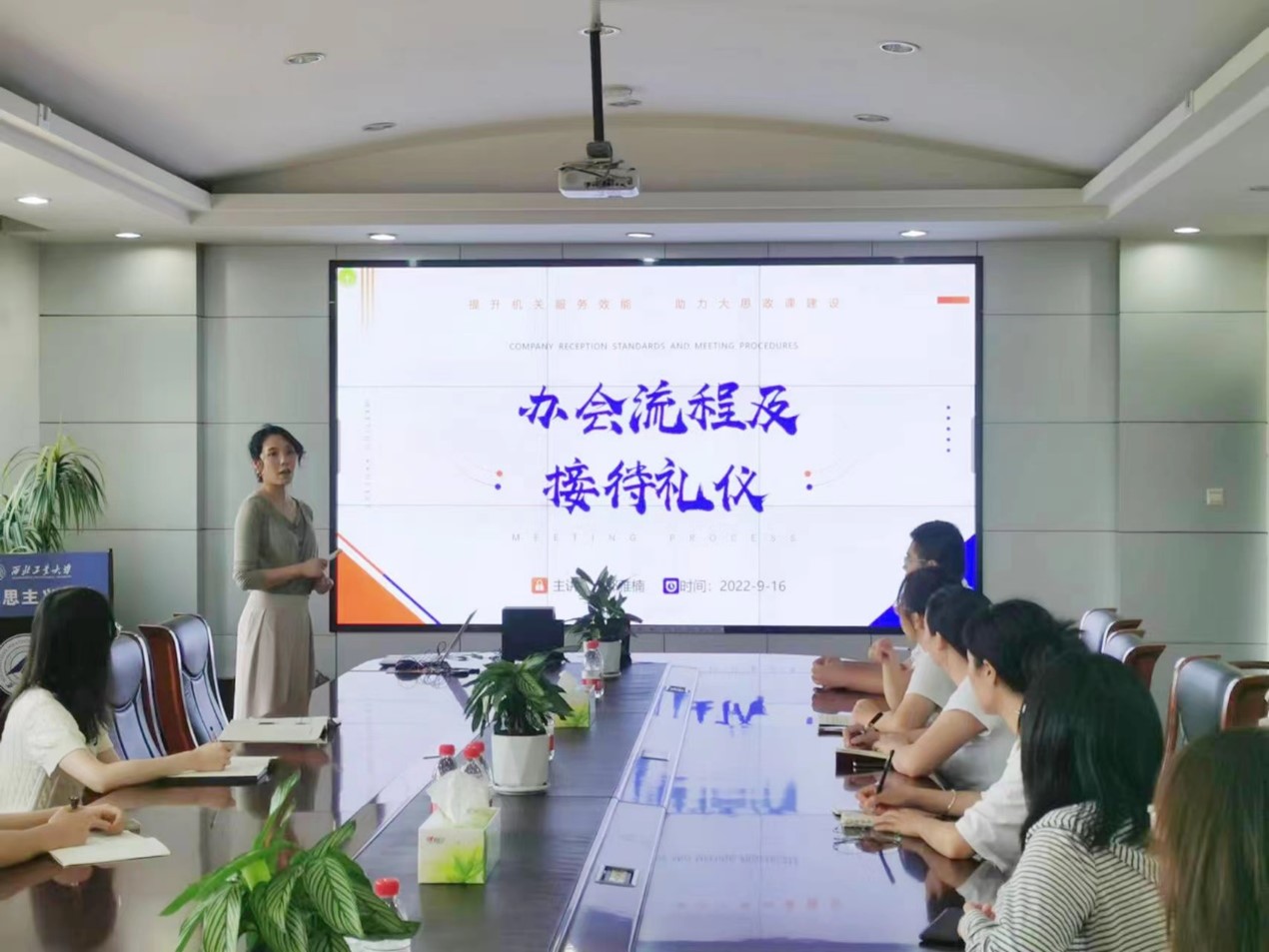 为进一步提高学院管理人员职业素养、提升院办管理服务效能,助力大思政课建设,9月16日,必赢242net官网机关在学院208会议室开展了“以提升管理服务效能为抓手,助力学院大思政课建设--办会流程与会务礼仪”专题培训,学院全体行政管理教师和学生骨干参加了会议。会议由学院办公室主任郭雅楠主持。