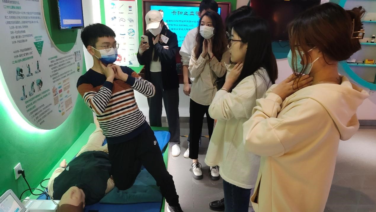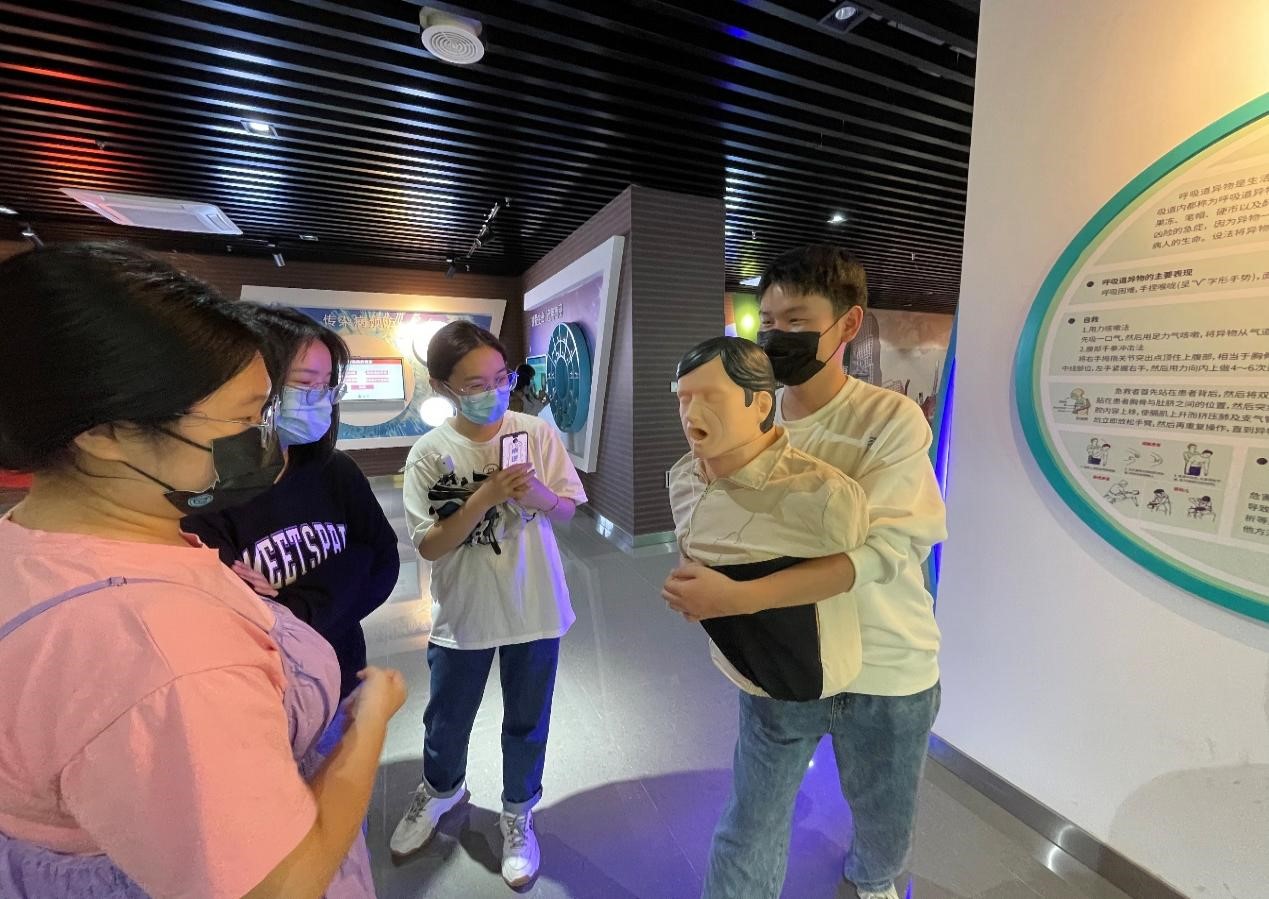 卫生铺健康之道,健康燃生命之光。在卫生健康安全展示馆,同学们不仅了解了日常卫生问题的处理和一些常用药物的使用,更在专业人士的指导下着重学习了“心脏复苏急救法”和“海姆立克急救法”。同学们积极参与,大胆实践,相互交流,利用假人对两种急救法进行了多次练习。