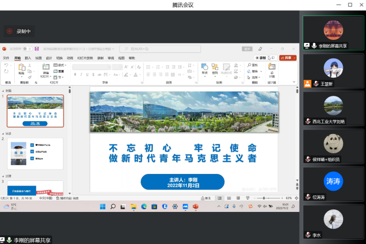 首先,李刚老师从青年的使命与责任切入,结合必赢242net官网研究生培养目标,指出学院学生党员在疫情防控、党史学习教育、志愿服务中展现出的模范先锋作用,正是彰显了青年马克思主义者的知行合一与责任担当。同时,李刚老师勉励大家,作为马克思主义理论学科的学生要有政治敏锐性和时代责任感,坚定理想信念,夯实理论基础,将个人抱负与时代、社会的发展紧密结合起来,将个人命运与国家、民族的命运紧密结合起来。