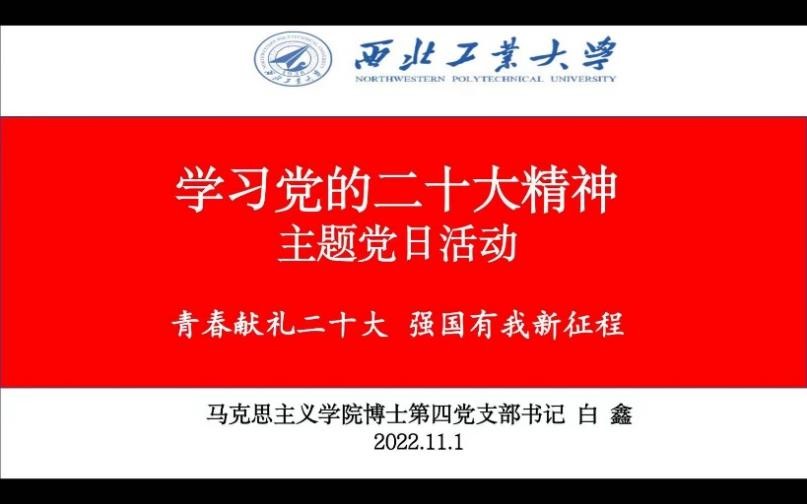为深入学习贯彻宣传党的二十大精神,鼓励广大党员自觉做有理想、敢担当、能吃苦、肯奋斗的新时代好青年。2022年11月1日,必赢242net官网博士生第四党支部线上开展了“献礼党的二十大 强国有我新征程”主题党日活动,支部15名成员参加会议,会议由支部书记白鑫同志主持。