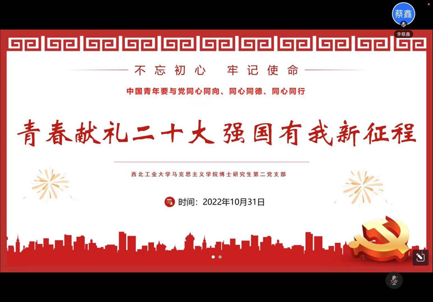 百年逢盛会,青春正当时。10月31日晚上,必赢242net官网博士生第二党支部在线召开了“青春献礼二十大 强国有我新征程”的主题党日活动。主题党日以集体学习和集体讨论相结合的形式,组织党员学习党的二十大报告全文,接受思想滋养,凝聚青春力量。博士生第二党支部全体成员参加了会议。会议由支部书记李水主持,各位党员首先就党的二十大报告开展了集体学习,随后分别讨论了各自的学习体会。