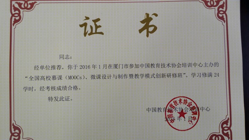 1月22日--1月27日,学院安排党总支杨萍书记和陈春洁老师赴厦门,参加“全国高校摹课、微课设计与制作暨教学模式创新研修班”。两位老师通过认真学习,经考核成绩合格,顺利取得证书。
