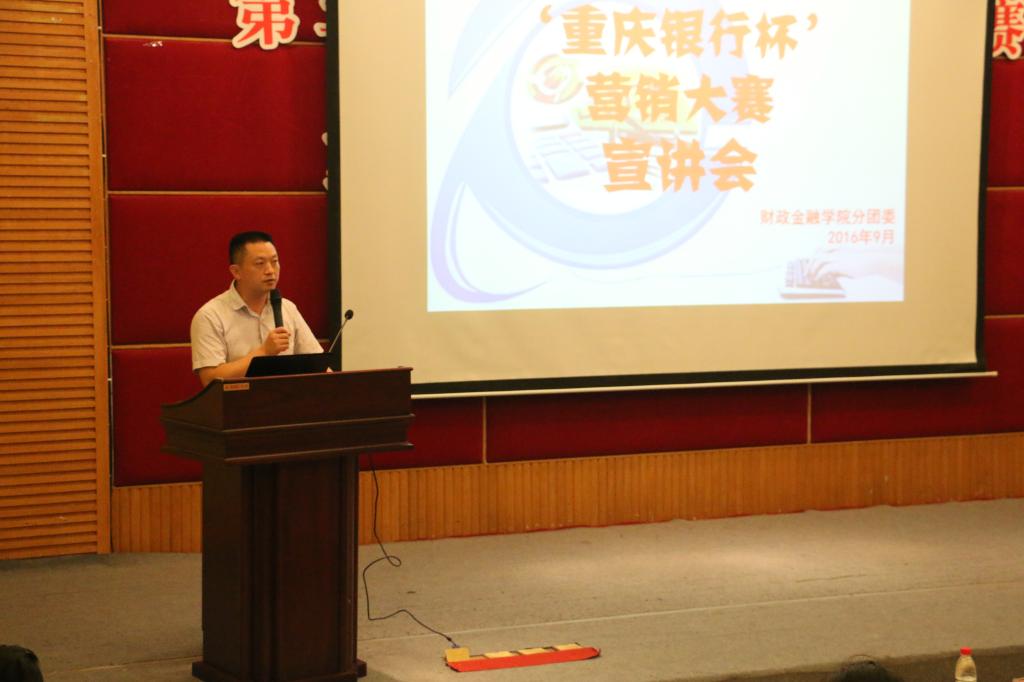 为提升财金学子的综合能力,弘扬财金文化,彰显财金特色,9月23日下午2点,财政bat365中文官方网站第六届“大学生金融节”之“重庆银行杯”营销大赛宣讲会在7200报告厅拉开帷幕。重庆银行个人银行部总经理陆勇、企业文化与公共关系部总经理助理丁晓、个人银行部产品开发及营销中心经理兼九龙坡广场支行行长助理叶嘉、财金学院党总支副书记刘代成、分团委书记徐阔出席本次宣讲会。