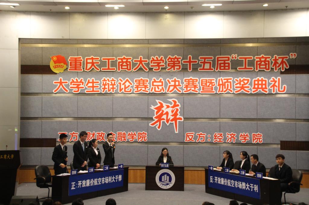 4月7日下午两点,bat365中文官方网站第十五届“工商杯”大学生辩论赛总决赛暨颁奖典礼在博智楼7100隆重举行。bat365与经济学院以“开放廉价航空市场利大于弊还是弊大于利”为辩题展开激烈辩论。团市委宣传部副部长林子琪,重庆邮电大学校辩论队教练齐东文,我校法学院党总支书记李自维,通识学院党总支副书记邹奇,校辩论队教练李长坤应邀担任本次决赛的评委。
