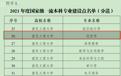 日前,教育部发布了《教育部办公厅关于公布2021年度国家级和省级一流本科专业建设点名单的通知》(教高厅函〔2022〕14号),bat365投资学专业入选国家级一流本科专业建设点。截至目前,学院已有金融学(2019年批准)和投资学2个国家级一流本科专业,占全校入选国家级一流本科专业建设点的10%。