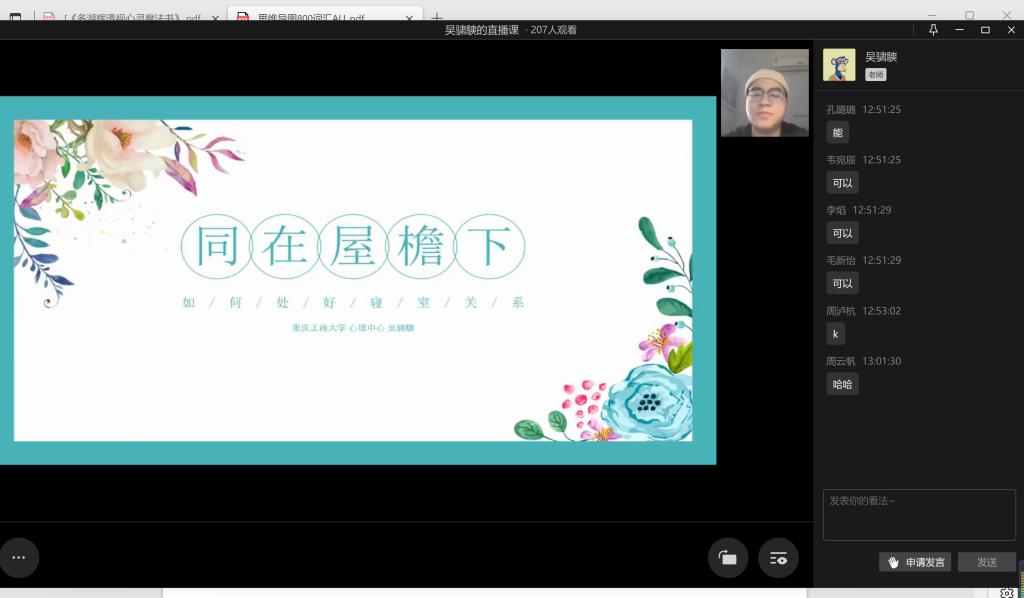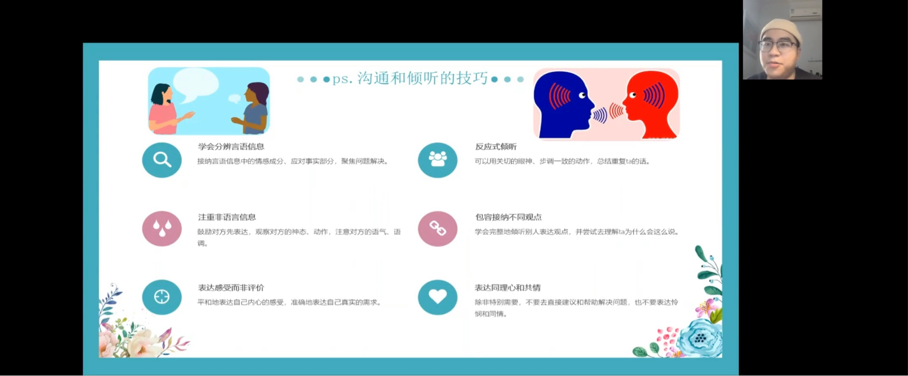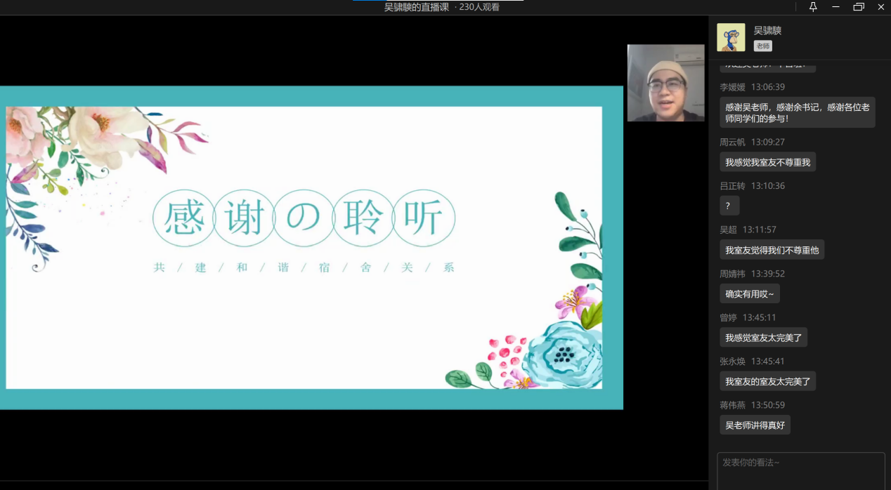 2022年11月11日中午13点,bat365中文官方网站心理工作站主办的“同在屋檐下——和谐寝室关系”心理讲座于企业微信线上平台顺利举办。此次讲座邀请到了学校心理健康教育与咨询中心吴骕騻老师作为主讲人,讲座内容丰富、寓教于乐,受到了同学们的热烈欢迎。