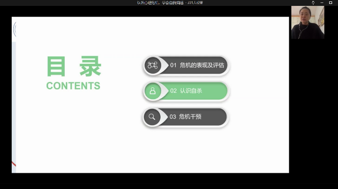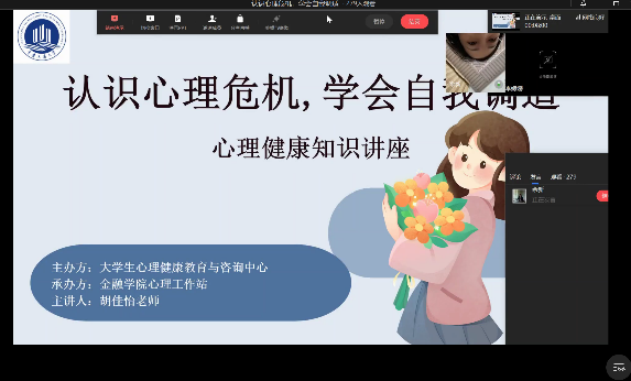 2022年11月15日中午12:30,bat365中文官方网站心理工作站举办的“认识心理危机,学会自我调适”心理培训讲座于企业微信线上平台顺利展开。bat365中文官方网站党委副书记余新出席活动,辅导员老师和学生共计近五百人参与此次讲座。bat365中文官方网站大学生心理健康教育与咨询中心负责人胡佳怡老师作为本次讲座主讲人,凭借自己心里工作丰富的经验和阅历分享了疫情之下的大学生心理的问题和疏导方法。
