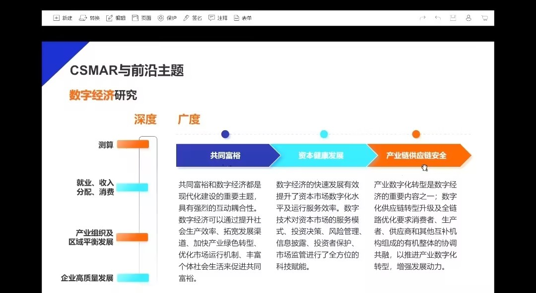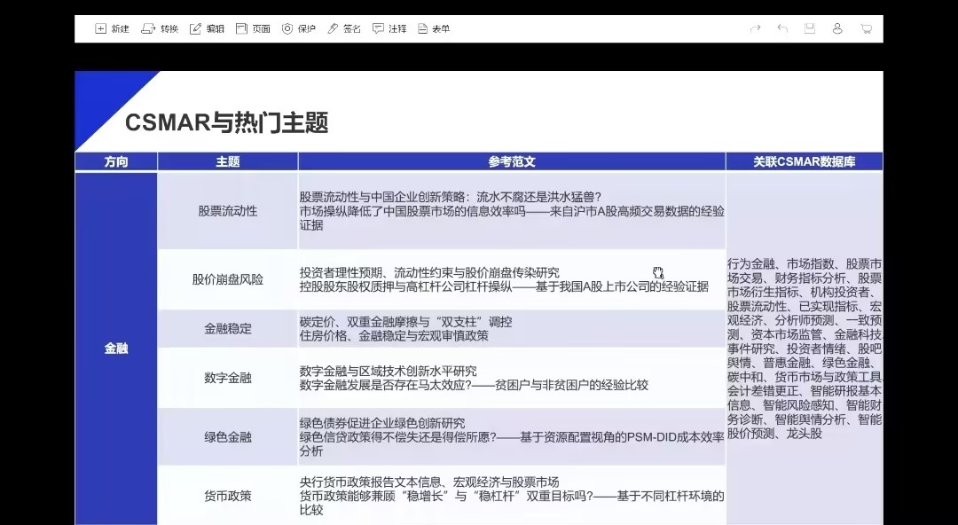在讲座中,杨老师还重点讲解了CSMAR与实证研究创新。首先是热门主题,即采用CSMAR发文较多的研究主题,这是CSMAR的经典领域,为初次研究的学生提供了可借鉴的参考。在此基础上,还可以进行更前沿的主题研究,达到学术上的创新突破。最后,杨老师整理了一份关于热门主题和前沿主题的资料,供同学们学习交流,利用CSMAR学习更多的知识。