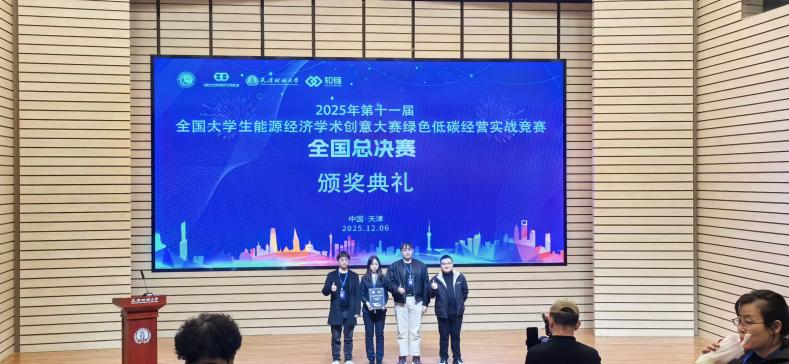 12月6日,2025年第十一届全国大学生能源经济学术创意大赛在天津财经大学圆满落幕。bat365中文官方网站bat365中文官方网站教师董翔宇博士指导,由杨明爚、韩静汝、丁文皓等学生团队在全国大学生能源经济学术创意大赛绿色低碳经营实战竞赛全国总决赛中,从全国100所参赛高校中脱颖而出,斩获赛事最高奖项特等奖,彰显了我校在碳金融交叉学科人才培养中的突出成效。