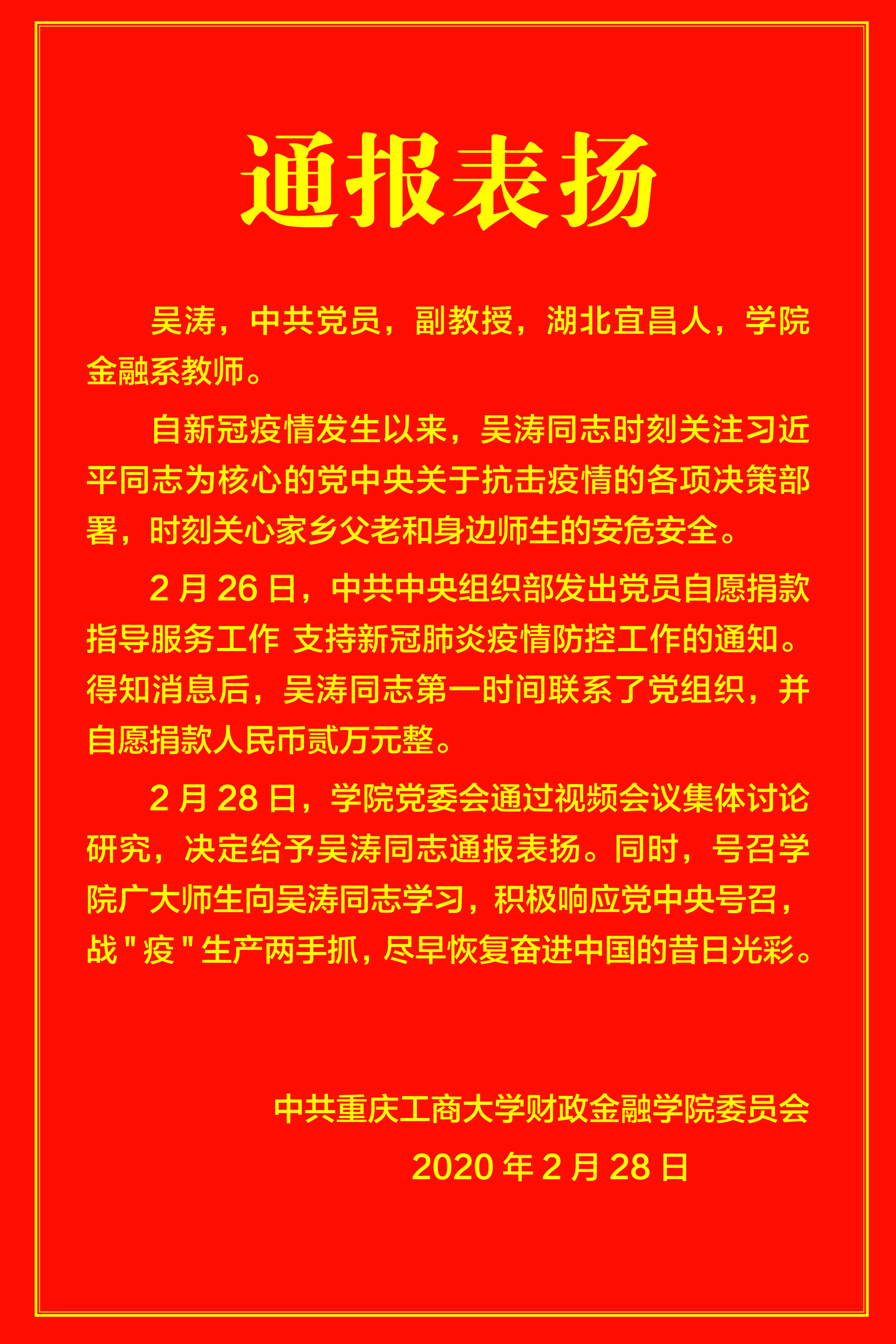 2月28日,学院党委会通过视频会议集体讨论研究,决定给予吴涛同志通报表扬。同时,号召学院广大师生向吴涛同志学习,积极响应党中央号召,战"疫"生产两手抓,尽早恢复奋进中国的昔日光彩。