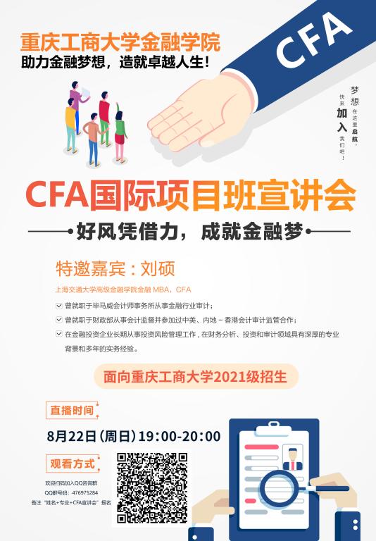 现将bat365中文官方网站2021级新生国际项目二次选拔bat365中文官方网站国际项目CFA(注册特许金融分析师)项目直播宣讲会有关事宜通知如下: