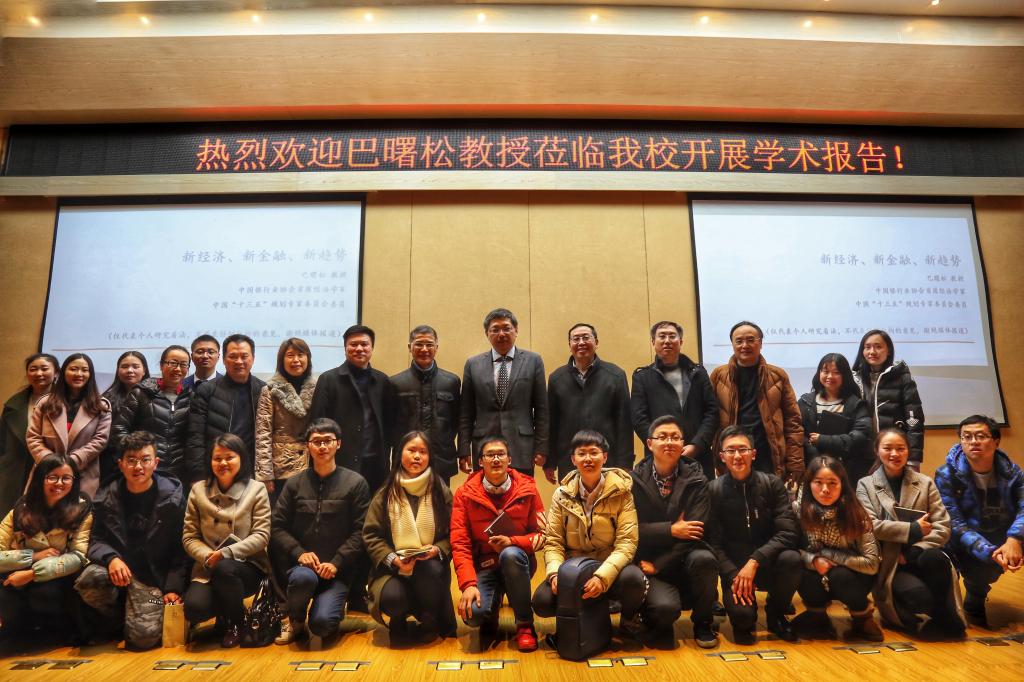 2017年12月21日下午2点,中国银行业协会首席经济学家巴曙松教授应邀来到bat365中文官方网站财政bat365中文官方网站学术报告厅50209给在校老师、研究生和本科生作了一场关于“新经济、新金融、新趋势”的学术报告。