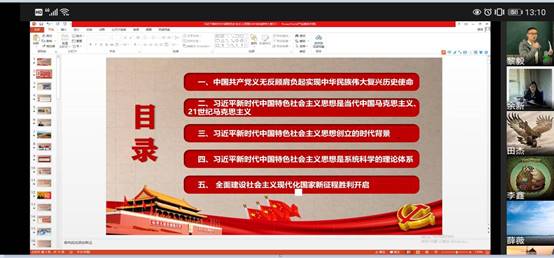 为进一步加强党的建设,全面贯彻落实“三会一课”主题党日活动,根据学校学院党委安排部署,bat365中文官方网站教工第一党支部于2021年7月5日通过企业微信召开党史学习教育专题党课,副院长王韧和支部书记黎毅分别为支部党员讲授题为《中美竞争的关键问题》、《习近平新时代中国特色社会主义思想与中华民族伟大复兴》。会议由支部委员李鑫同志主持,包括学院党委副书记、院长王兰、学院党委副书记、纪委书记余新、专职组织员赵甫刚在内的全体党员参加本次会议。