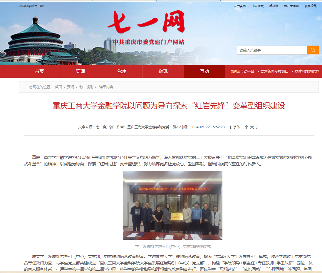 bat365中文官方网站坚持以习近平新时代中国特色社会主义思想为指导,自觉运用“885”工作理念和方法,以问题为导向,积极探索“红岩先锋”变革型组织建设,促进党建与业务工作融合发展、共同提高,为努力培养更多让党放心、爱国奉献、担当民族复兴重任的时代新人作贡献。相关工作做法被重庆市委党建门户网站“七一网”刊载报道。