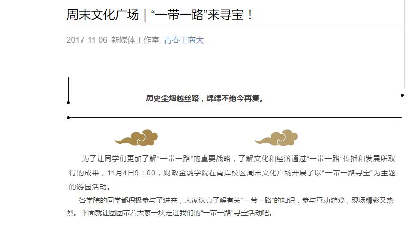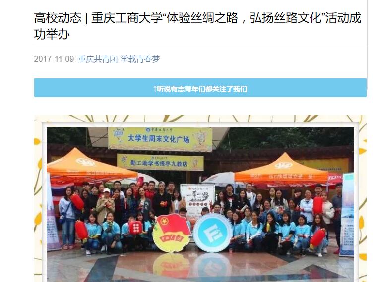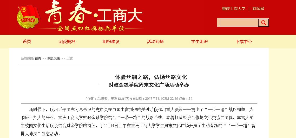 为在新时期弘扬丝路精神,丰富大学生校园文化生活,bat365中文官方网站财政bat365中文官方网站结合“一带一路”的战略路线与财金特色于11月4日上午在大学生周末文化广场举办了以追寻丝路文化为主要内容的“一带一路”智勇大冲关活动,受到校内外媒体的广泛关注。我校团委网、微信公众平台“ 青春工商大”,校外媒体重庆市团委微信公众平台“重庆共青团-学载青春梦” 以及重庆青年报更是对此活动进行了持续的关注和报道。