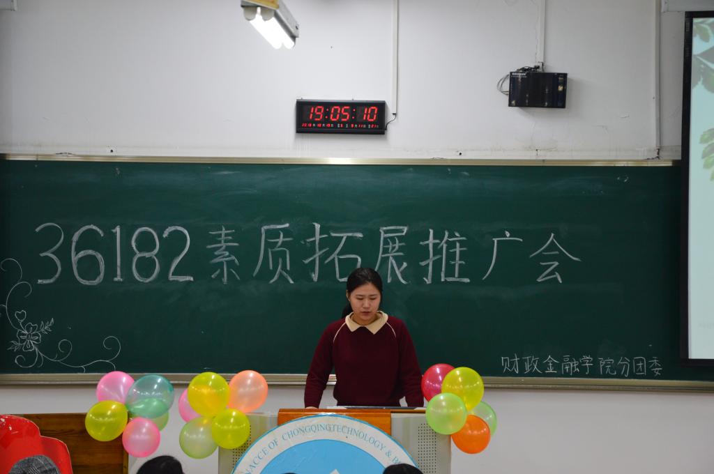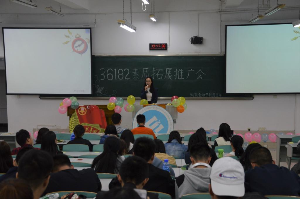 2018年10月19日晚上七点,由财政bat365中文官方网站分团委主办的第八届青马文化月之“36182”素质拓展推广会活动在博智楼07106顺利开展。本次素拓推广会对18级CFA新生及17级同学的素质拓展计划提出合理化建议,引导和激励学生更好地进行素质拓展。