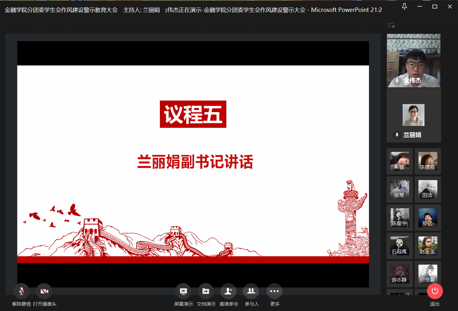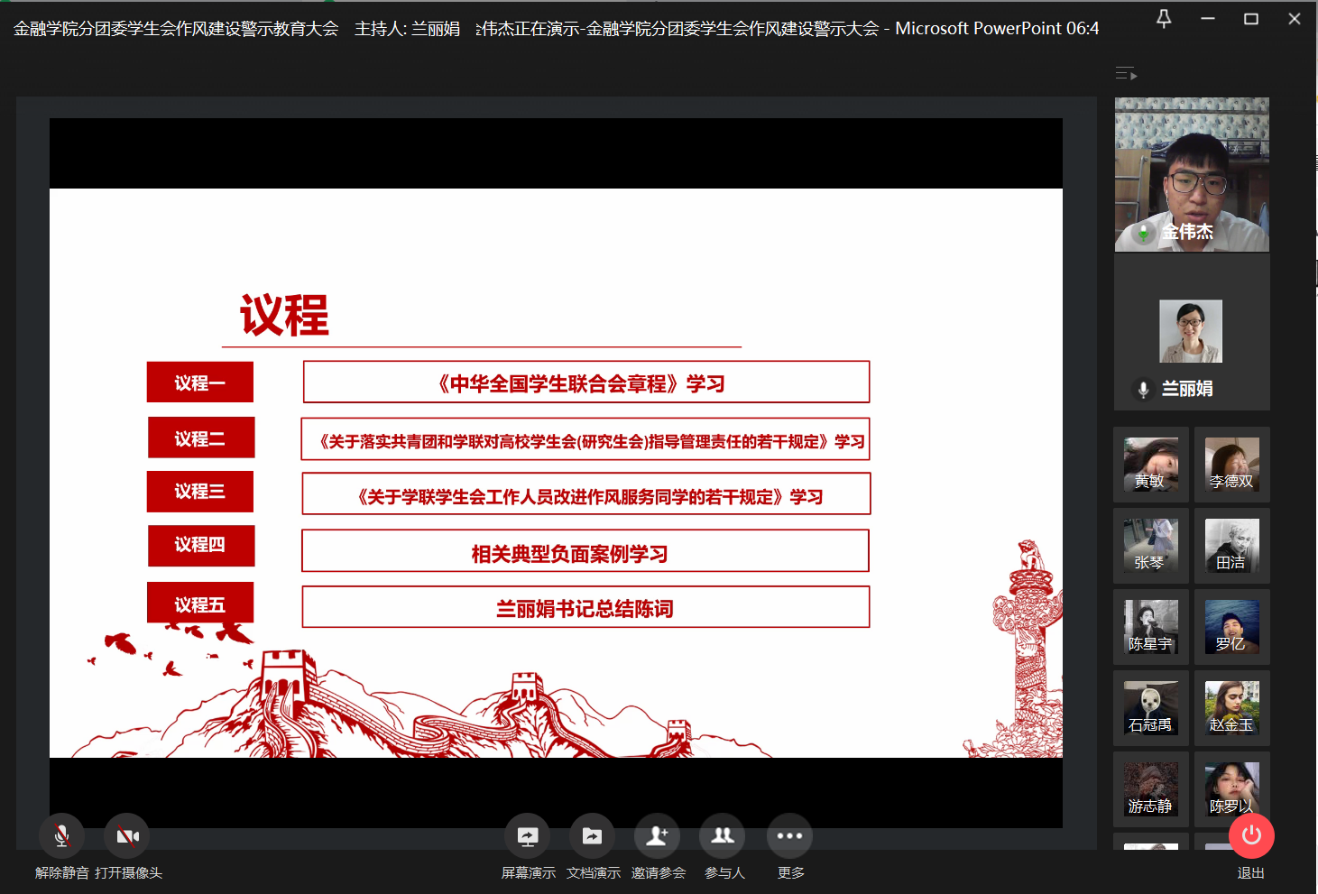 为加强学生干部作风建设,引导学生会和谐健康发展,2020年11月25日21:00,bat365中文官方网站分团委学生会于企业微信召开线上作风建设警示教育大会,学工办副主任、分团委副书记兰丽娟老师与学生会全体成员参与了本次大会。