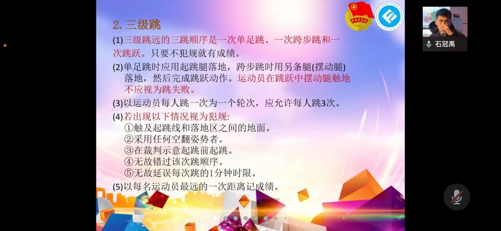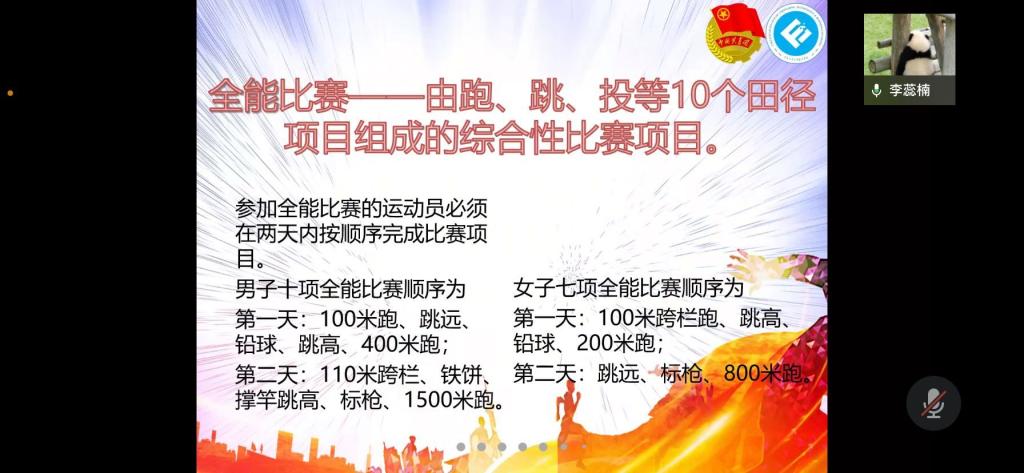 2022年3月18日19时,bat365中文官方网站体育技能培训大会在企业微信顺利举行。本次会议由bat365中文官方网站分团委学生会体育部部门负责人熊芯、石冠禹、李蕊楠分别对田径运动径赛、田赛、全能比赛进行介绍,旨在提高同学们的体育知识与技能。