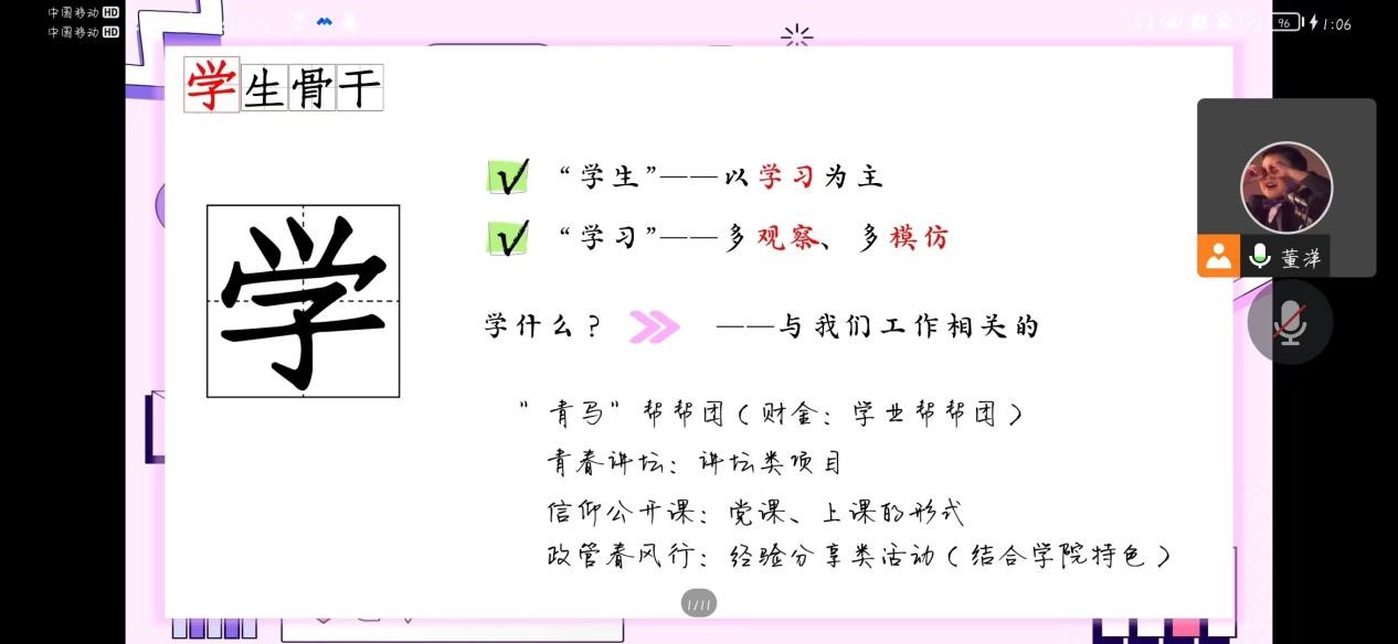 董洋首先从“学生骨干”四个字分别展开讲解,说明学生干部应以“学习”为主,具有“生气”并积极“生长”,拥有高尚的“品格骨气”,作为“干事”要努力行动付出,强化学生干部的模范带头意识,培养学生干部的模范带头能力。他分享了六个小技巧和七个小心得,让学生干部在平时工作中更加得心应手。针对团队建设提出六点要求:团队建设应该有奖也有罚;应有定期的团建;团队中的每一个人都需要被看见;团队内部应有人情味;团队活动应有总结有反思;团队例会不仅仅是例会,更是沟通的机会。