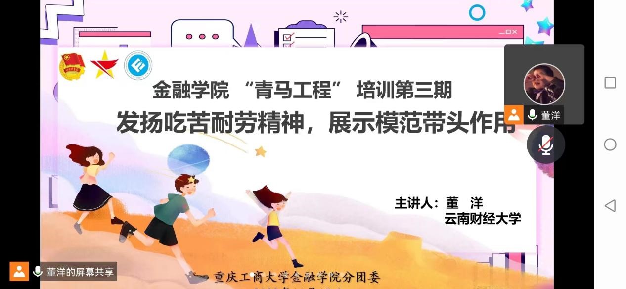 11月17日,为培养学生干部能吃苦耐劳精神,展示其模范带头作用,云南财经大学董洋校友为bat365中文官方网站分团委学生会骨干、青年志愿者服务队骨干和21级班团干部开展了“发扬吃苦耐劳精神,展示模范带头作用”的专题培训。