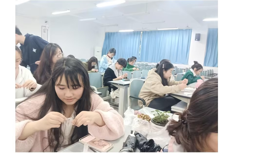 2023年3月17日晚上18:00,在b206教室开展制作木簪手工活动。本次活动由手工部杜清莉为大家耐心展示制作细节与步骤。首先,先将珠子用金丝穿过缠绕拧紧,制作到一定数量,然后再用同样的方法,用金丝把叶子拧紧,之后将叶子和珠子按自己喜欢的样子缠绕一起,通过木簪上面的小孔,紧紧的固定在上面,再用同木簪颜色一致的细线进行二度缠绕固定,这样我们就可以制作简易发簪啦!“发簪”这个概念在众人眼中,大多与女子有所关系。不过到场的居然也有不少男同学,他们同样仔细认真,虚心求教。同学们或凝神思索,或起身询问,或翻找材料,每个人都在为亲手做出发簪而努力。