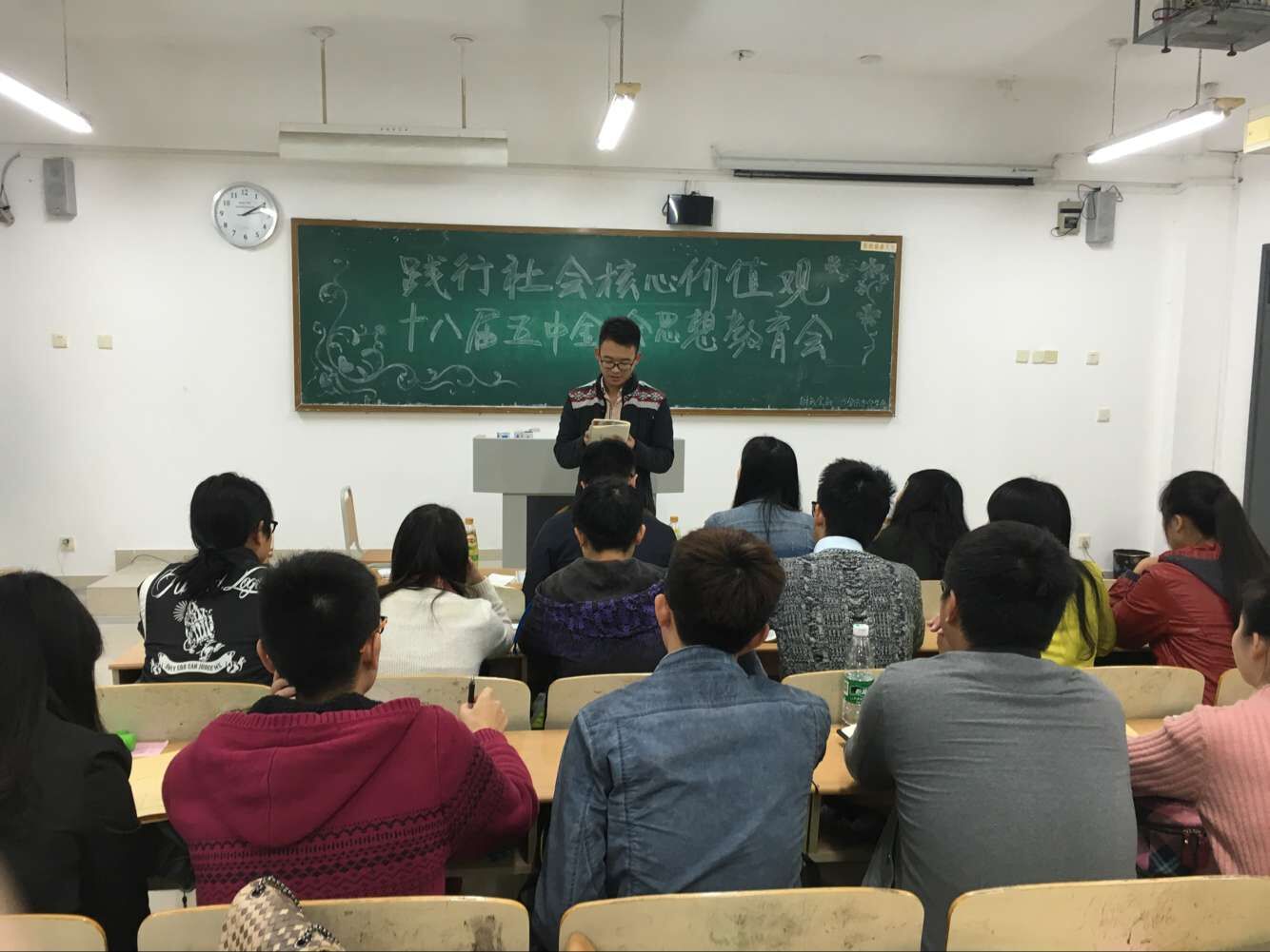 11月24日中午,财政bat365中文官方网站召开了以“践行社会主义核心价值观”为主题的十八届五中全会思想教育会。由财金学生副主席王庆峰作为主讲人,财金学生会主席团、部长代表及各班代表出席了本次会议。