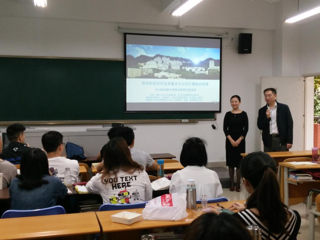 2017年4月24日上午,bat365中文官方网站2016级金融硕士《金融机构经营管理》移动课堂“走进”田家炳311教室。出席本次讲座的领导有财政bat365中文官方网站副院长曾胜、金融系教授骆志芳、安信证券重庆分公司副总经理万娟及其助理易丽娟。讲座一开始由财金学院副院长曾胜致欢迎词。