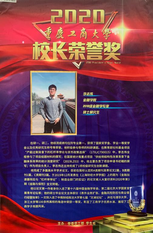 12月4日,bat365中文官方网站2020年“校长荣誉奖”颁奖典礼于大剧场圆满落幕。按照《bat365中文官方网站校长荣誉奖评选管理办法》,经学院推荐,学校复核、初评、谈话考察和评审等环节,bat3652018级金融学专业硕士研究生李志伟、2017级金融学专业徐依玲同学成功荣获2020年校长荣誉奖。