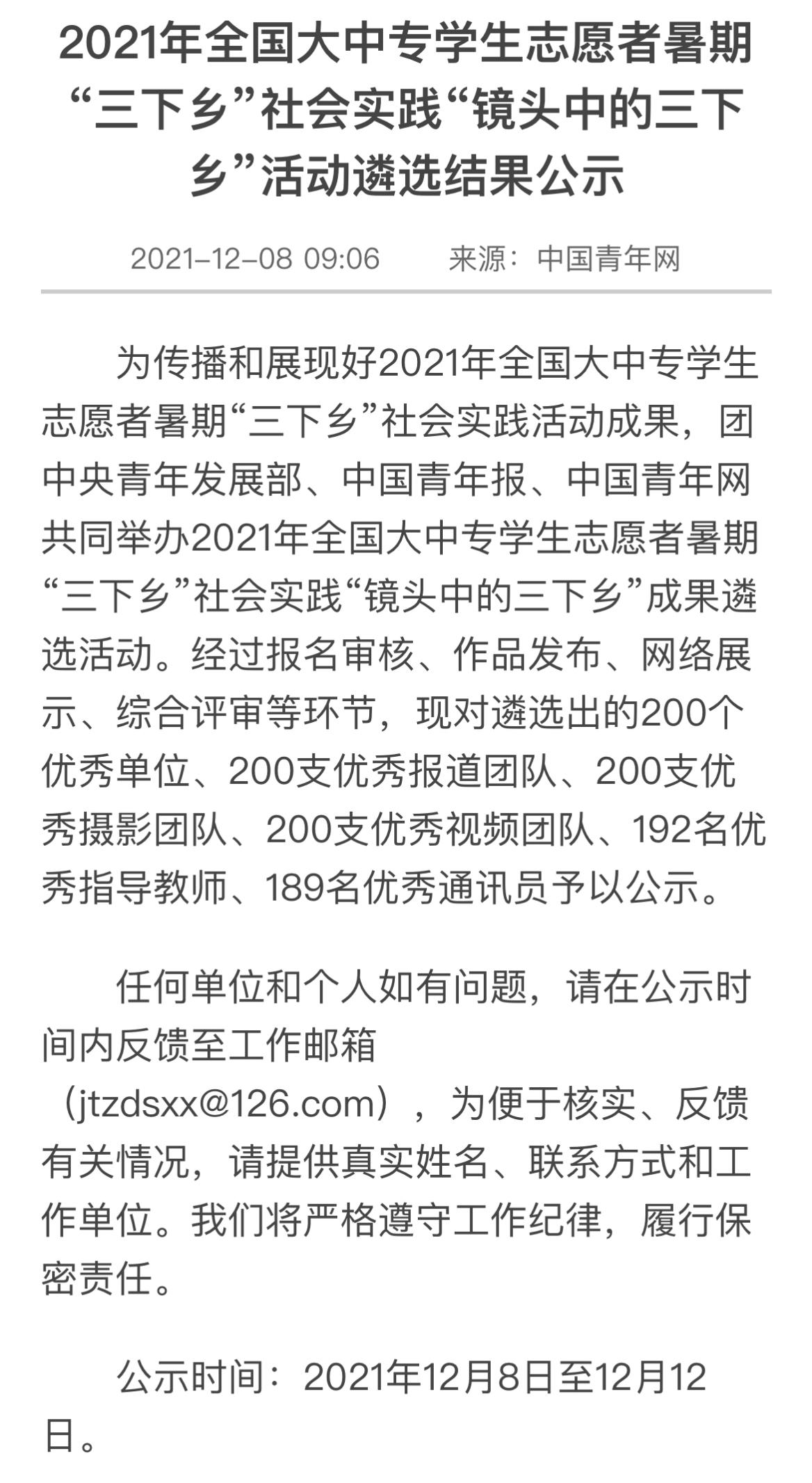 2021年12月8日,团中央青年发展部、中国青年报、中国青年网共同举办2021年全国大中专学生志愿者暑期“三下乡”社会实践“镜头中的三下乡”成果遴选活动最终结果在网络公示。bat365中文官方网站bat365中文官方网站暑期“三下乡”社会实践团队“心系神州事 情融牡丹乡”国情观察实践团荣获“优秀视频团队”称号。