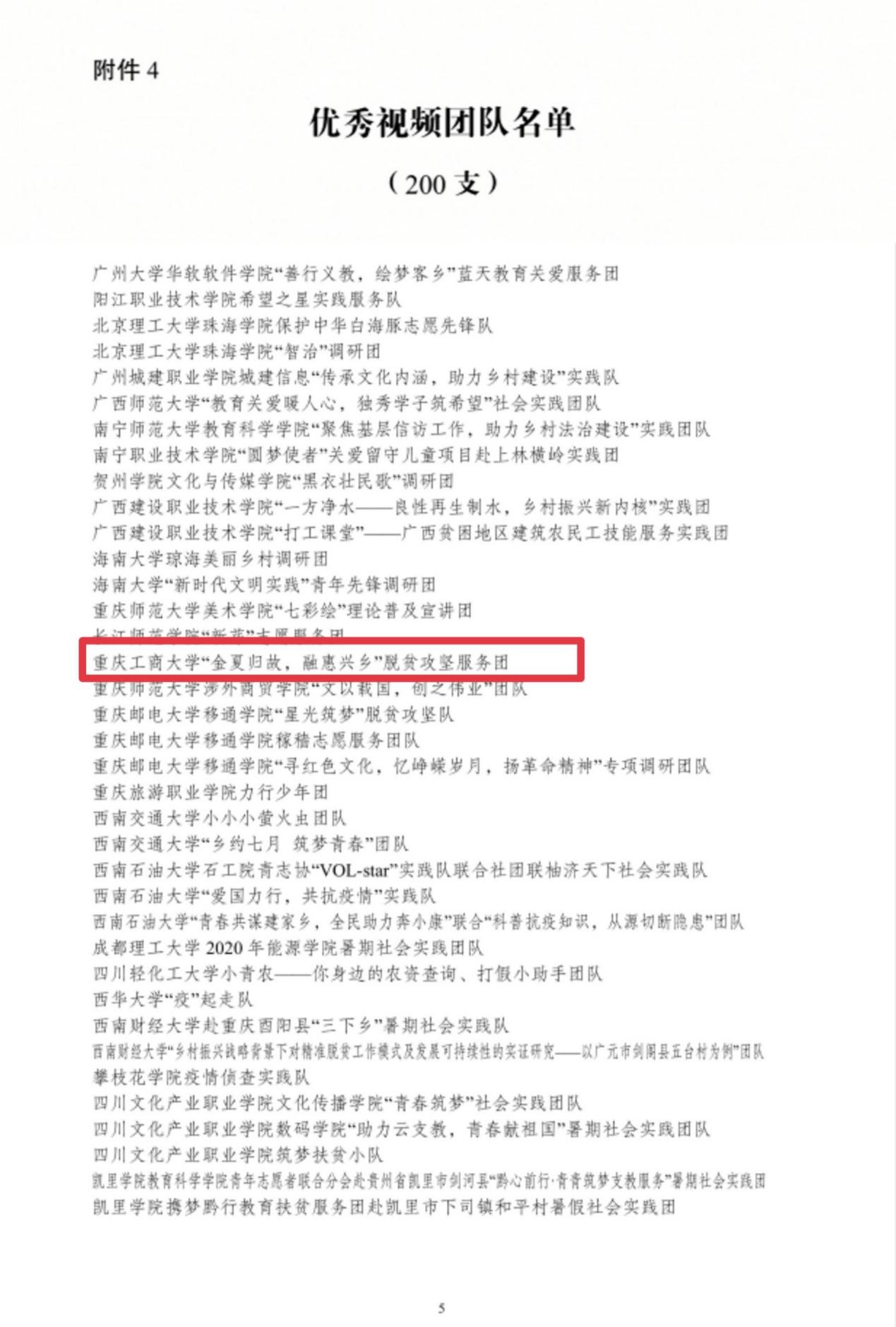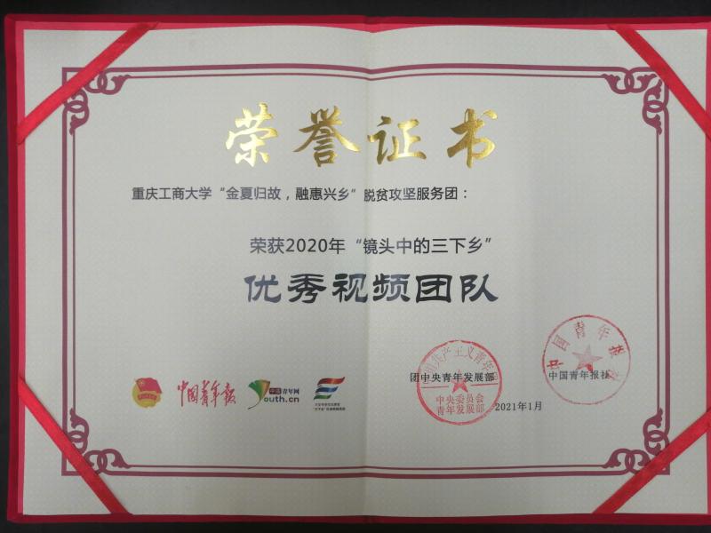 2020年11月23日,团中央青年发展部、中国青年报、中国青年网共同举办2020年全国大中专学生志愿者暑期“三下乡”社会实践“镜头中的三下乡”成果遴活动结果公示,bat365暑期“三下乡”社会实践团队——“金夏归故,融惠兴乡”脱贫攻坚服务团荣获“全国优秀视频团队”荣誉称号。