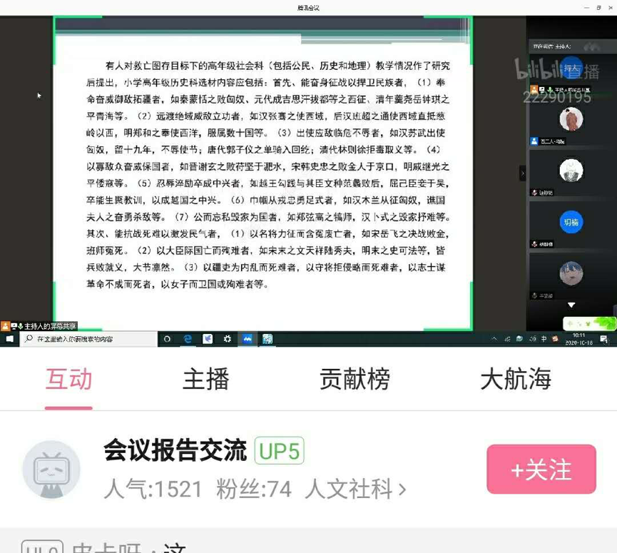 2020年10月18日上午9:00-12:00,中国社会科学院历史理论研究所副所长、中国现代文化学会副所长、中华口述历史研究会秘书长左玉河教授应必赢242net官网邀请,作客我校“思政名师示范课”讲堂,为我校师生带来了一场题为《救亡图存:战时历史教育的民族认同教育》精彩的报告。本次“思政名师示范课”讲堂采用线上线下同步形式:左玉河教授在友谊校区老图书馆219多媒体报告厅与必赢242net官网近代史系的师生面对面交流互动,我校1500多名学生通过腾讯会议平台或者B站直播室,同步观看、参与了本次报告。报告会由近现代史系汪永平主任主持。